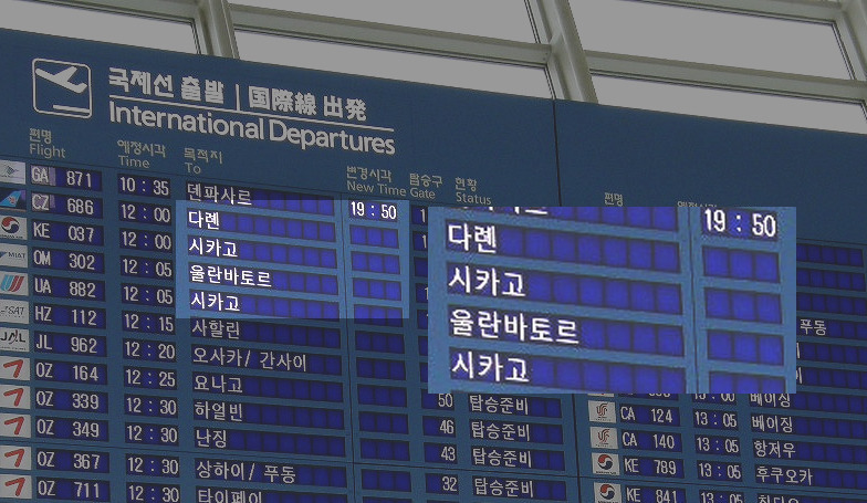 공항 전광판을 자세히 보면 '글자 한 개 = 사각형 한 칸'으로 돼있다. 그리고 전광판 색보다 약간 진한 색이 글자 바탕에 깔려있다. 인천공항 전광판을 보면 전광판 자체는 약간 진한 청바지 같은 파란색, 글자 바탕은 문서 프로그램에서 파란색 설정하면 나오는 가장 기본적인 파란색, 글자는 하얀색이다.