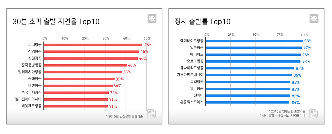 이번 글에서 다시 그릴 차트는 바로 위 기사에 실린 '30분 초과 출발 지연율 Top 10 항공사', '정시 출발률 Top 10 항공사' 그래프다.