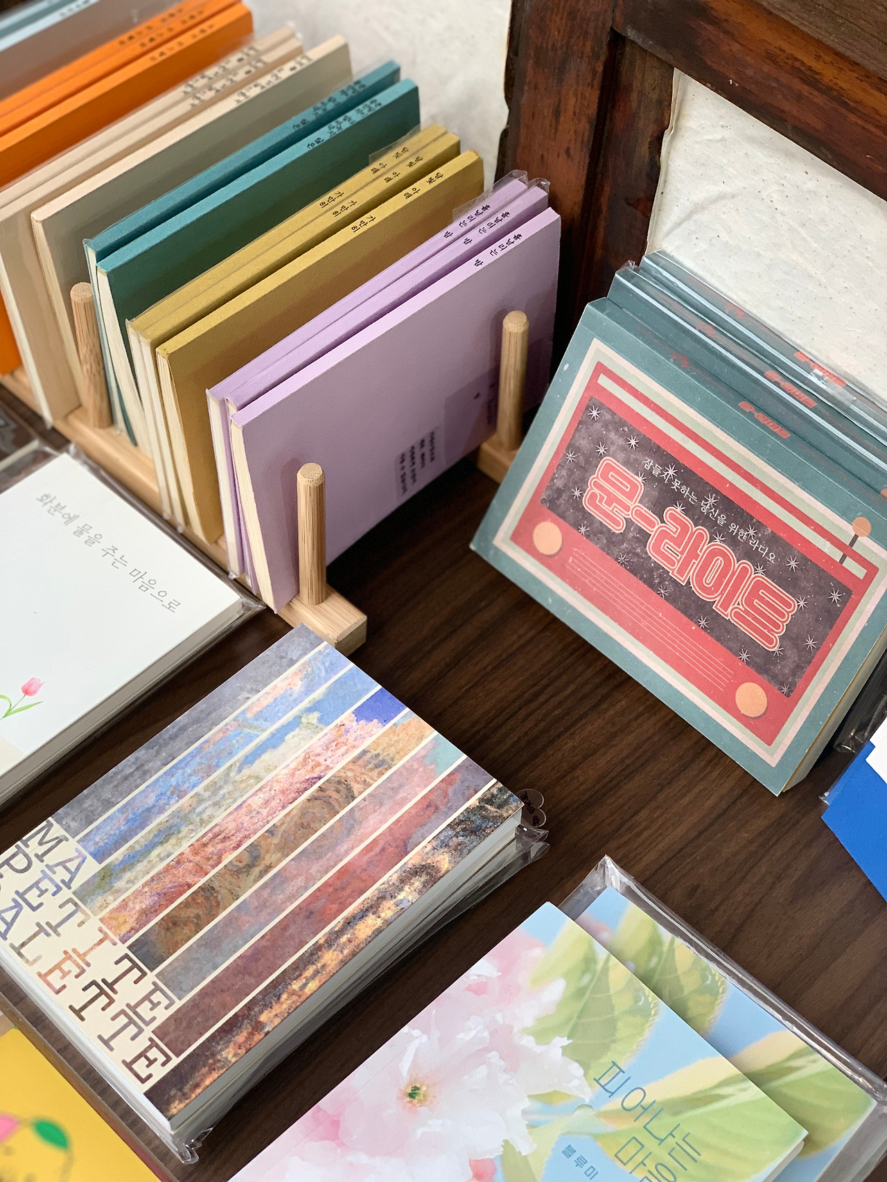 그렇게 한 시간 가량 구경을 하고 책 두 권을 골라 계산대로 갔는데, 사장님이 너무나 친절하게 “천천히 구경해주셔서 감사합니다”라고 말씀해주시는 게 아닌가. 나는 속으로 ‘이렇게 예쁜 곳을 천천히 구경하게 해 주시다니, 제가 더 감사하죠…’라고 했고. 혹시 작가님이냐고 물어보시는 사장님께 그렇다고 답했다. 내내 밝게 웃으며 대화를 했는데 책방도 주인을 닮아가나 싶었다. 독립출판물 특유의 먼지 묻은 듯한 종이를 많이 만져서인지 손이 부슬부슬했고, 새로 교체된 인센스 스틱이 반 정도 타고 있을 즈음에 서점을 나왔다. 햇빛이 들어오는 예쁜 책방. 더욱 소중해질 예정이니 궁금하면 얼른 가보시길 추천하며.. 나는 구매한 책을 맛있게 읽을 예정임을 밝힌다.