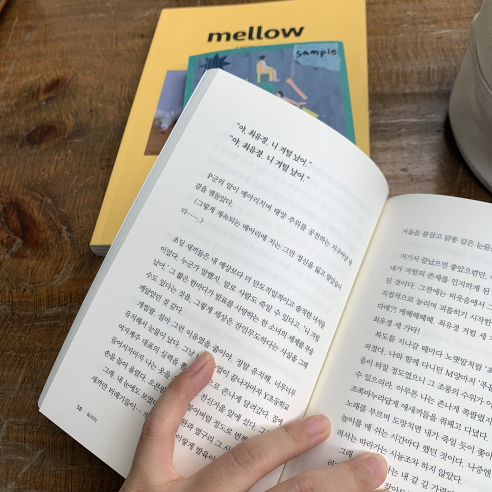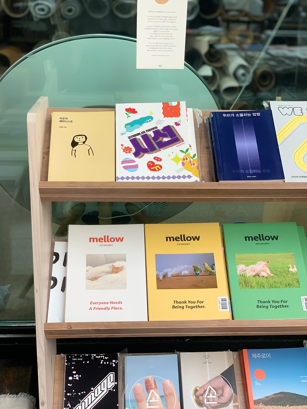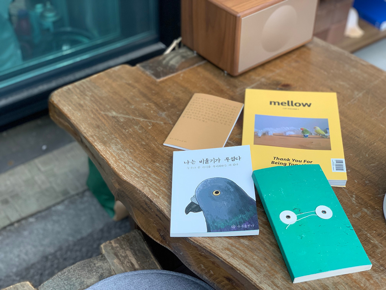종로에 있는 독립서점 <마당 책방>에 갔다. 내가 쓴 <파도 시집선 008 여름>이 진열되어 있으며, 파도 시집선 시집들을 포함해 다양한 독립출판물이 있는 곳이다. 인스타그램을 통해 소소하고 예쁜 공간이란 건 알았지만 직접 와보니 더욱 따뜻한 정취가 느껴졌다. 한옥 마당을 개조한 서점이라니. 도시에 이런 공간은 무척 특별하지 않은가. 나는 독립 출판물이 이렇게나 다양하다는 걸 처음 알았다. 오로지 사진으로만 구성된 사진집과 손바닥만 한 단편 소설집 시리즈, 이전에 갔던 책방무사 주인 ‘요조’ 작가님 책도 볼 수 있었다. 반려동물 매거진 <mellow>에서는 내 눈이 잘못된 건가 싶은 고양이 + 앵무새 조합도 있었는데. 실제 새를 키우고 있는 나로선, 그 둘을 함께 키우고 있는 어떤 집사의 인터뷰에 눈이 갈 수밖에 없었다. 다행히 고양이가 앵무새를 공격하지 않고 잘 지낸다고- (오히려 앵무새가 양아치 짓을 한다고 해서 공감하며 웃었다.) ‘멜로우: mellow’는 긴장을 풀고, 삶 속의 단순하고 자연적인 즐거움을 조용히 즐기는 상태라는 의미인데 동물들은 그저 살아감으로써 이 긴 문장을 직관적으로 보여준다는 거다. 재밌는 매거진이다.