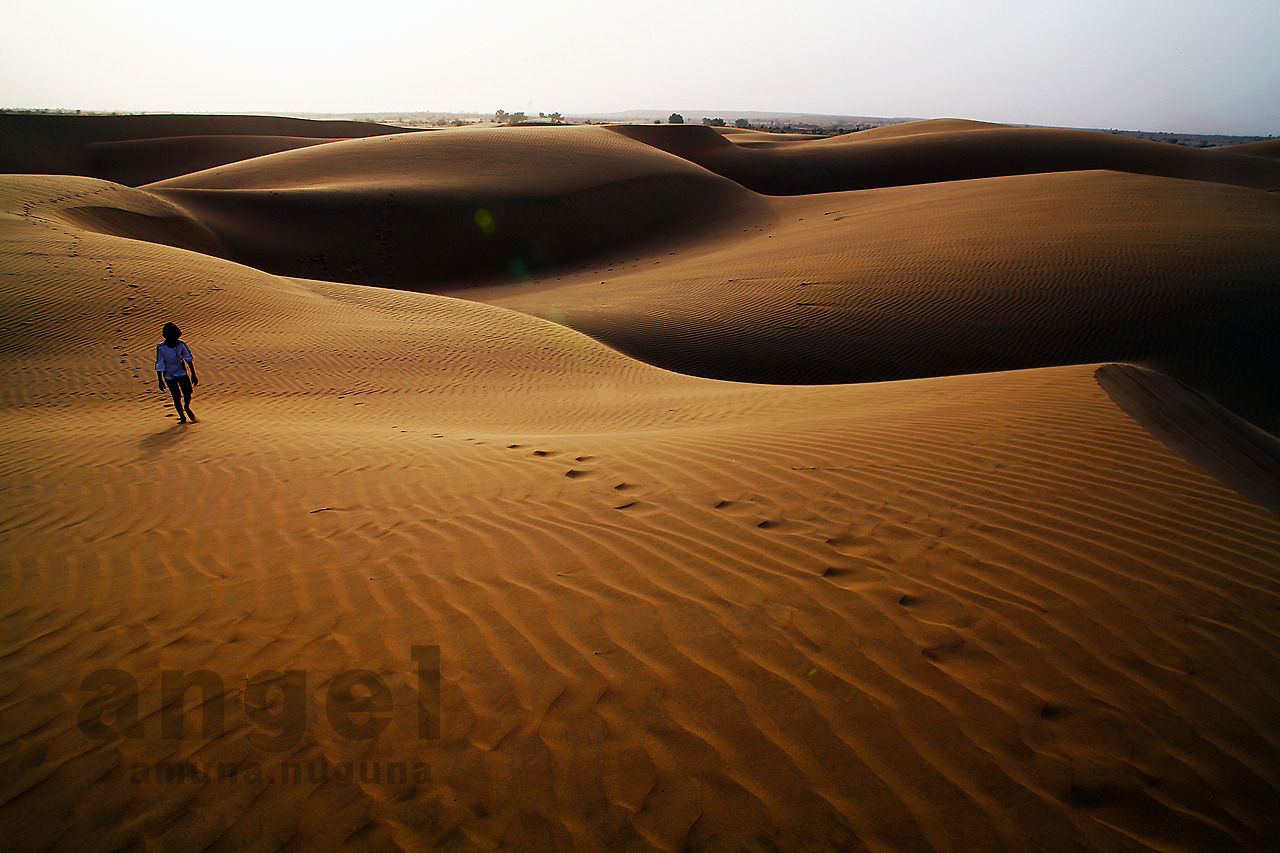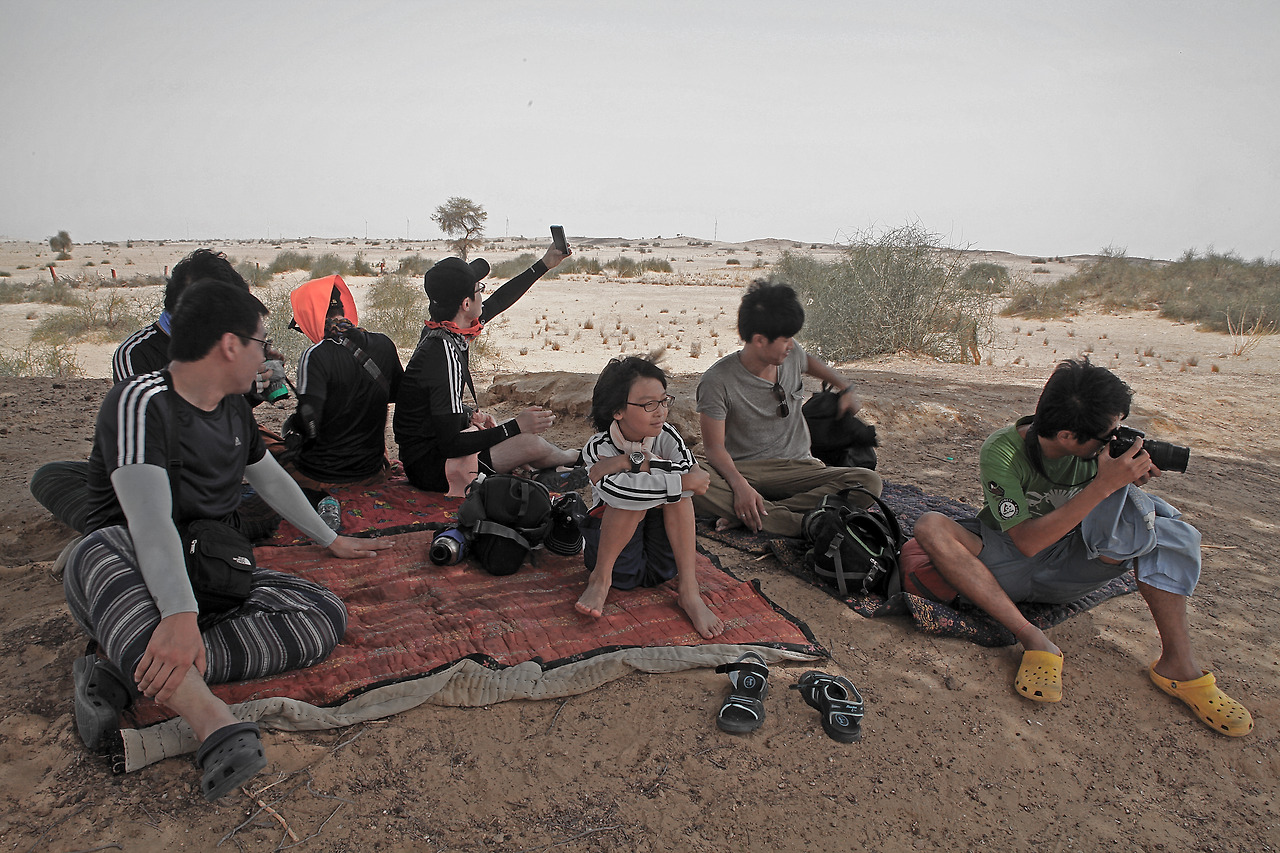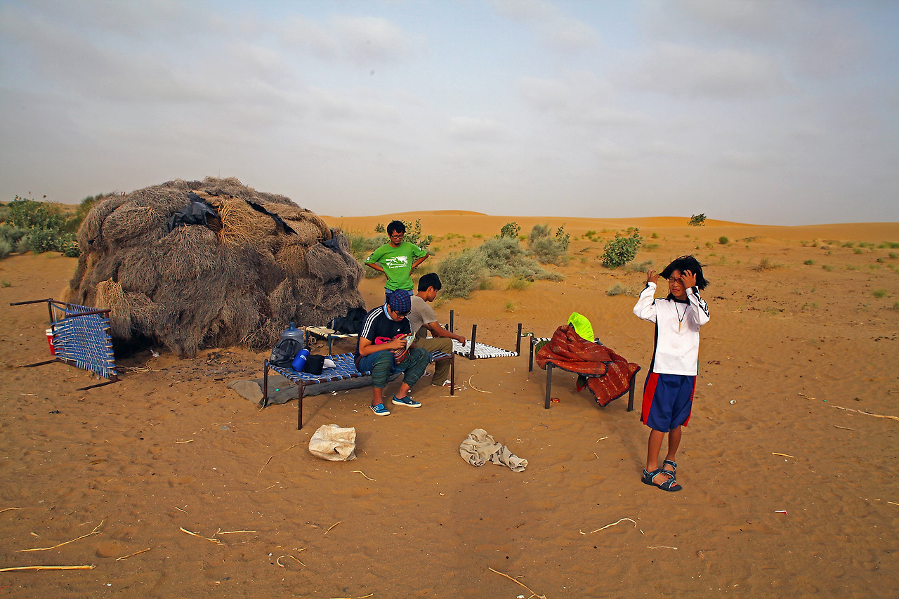 마른 풀들을 얽어 만든 움막에 도착했다. 밖에서 별을 보며 자려고 했지만 바람이 많아 단념했다. 뜨겁고 달콤한 짜이와 함께 따가운 모래 바람이 미리 예약한 여행의 옵션 처럼 같이 했다. 바람이 없으면 짜이의 맛을 제대로 느낄 수 없다는 듯이... 사진을 찍으려는데 메모리 카드를 포맷하라는 메시지가 뜬다. 포맷을 하면 3일간 촬영한 사진을 지워야 한다. 지우기로 했다. 그런데 다시 저장공간이 부족하다는 메시지가 나타난다. 음. 말도 안 돼. 사막에서 미나리가 자라는 소리였다. 용량은 문제가 없어 보였지만 동영상 하나를 지웠다. 그 시간 어울림은 모래 언덕을 누비며 시간을 보내고 돌아 와서는 내게 주변의 모든 언덕을 올랐다고 했다. 정복자의 표정이었다. 중국인 여행자는 이곳의 모든 것을 사진에 쓸어 담으려 했다. 한참 유행하고 있는 점프샷을 요구해 모두가 펄쩍펄쩍 뛰기를 반복했다. 숨이 차올랐다.