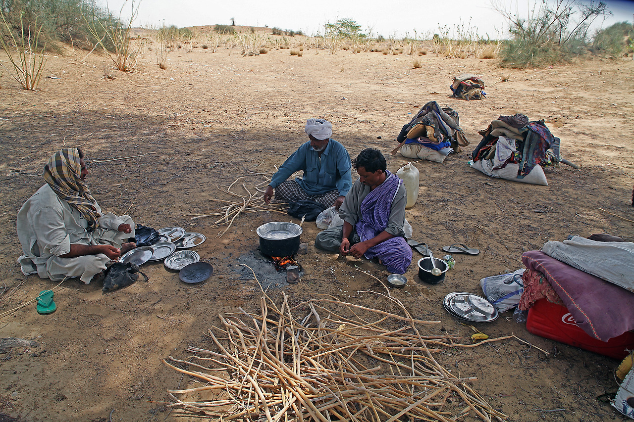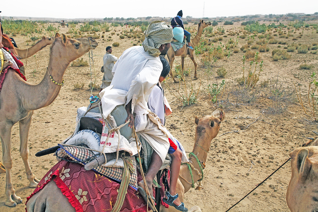 점심을 먹기 위해 잠시 멈추었다. 그늘에 담요 세장을 깔고 쉬었다. 모래 바람이 세차게 불었다. 입안에서 모래가 씹히기 시작했다. 세 명의 셰프?는 마른 가지를 모아 불을 붙이고 장보고는 식판을 닦았다. 식판에 아주 약간의 물을 붓고 모래를 한 줌 집어 쓱쓱 문지른다. 그리고 털어 낸 다음 다시 마른 모래로 깨끗이 닦아내자 반짝 빛이 난다. 환경이 생활의 방식을 결정짓는 장면이었다. 점심 준비가 늦어지자 사람들은 누워서 잠을 청하기도 했다. 담요는 조금의 푹신함과 경계를 나타 낼 뿐 모래를 막아내지는 못했다. 카레와 짜파티는 먹을 만했지만 어금니는 모래를 으깨기에 바빠졌다. 한낮의 더위를 피해 3시에 출발한다고 했다. 편히 쉬며 그동안 잠이라도 자라고 한다. 모래 바람에 숨을 쉬기만 해도 입안은 어석거리는 소리를 냈다. 어울림은 벌레와 곤충들에 관심을 보이며 주변에서 한참을 놀다가 피곤했는지 내 무릎을 베고 눕는다. 그리고 잠에 빠져 들었다.