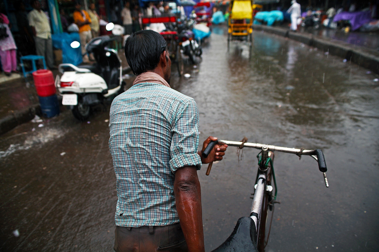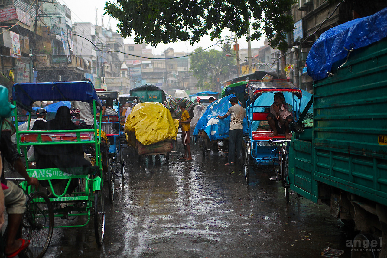 릭샤는 길을 뚫지 못하고 머뭇거리기만 했다. 수레와 자동차와 릭샤와 사람들이 뒤엉키고 있었다. 이러다가 그냥 비를 맞겠네 하는 생각이 몇 미터 벗어나기도 전에 빗방울이 떨어지기 시작했다. 릭샤는 지붕이 있었지만 바람이 세게 불자 비는 옆으로 누워 들어왔다. 바람이 멈추자 폭우가 쏟아졌다. 우리의 릭샤 왈라가 페달을 밟기 시작했다. 거리는 텅 비었다. 빗줄기만 거리를 채우고 있었다. 그 많던 사람과 수레와 릭샤는 멈추어 있었다. 비를 피하거나 맞으면서 도로 옆이나 건물 밑에 서 있었다. 그러나 고지식할 만큼 투철한 직업정신을 가진 우리의 릭샤 왈라는 페달을 계속 밟았다. 그에게 페달을 멈추는 것은 스스로를 욕되게 하는 것이라 믿고 있는 것 같았다. 어울림과 나는 비에 흠뻑 젖었다. 릭샤 왈라가 페달을 밟는 게 여의치 않자 안장에서 내려 끌고 가기 시작했다. 물은 발목까지 올라왔다. 거리의 쓰레기들이 물에 떠서 낮은 곳으로 쓸려갔다.