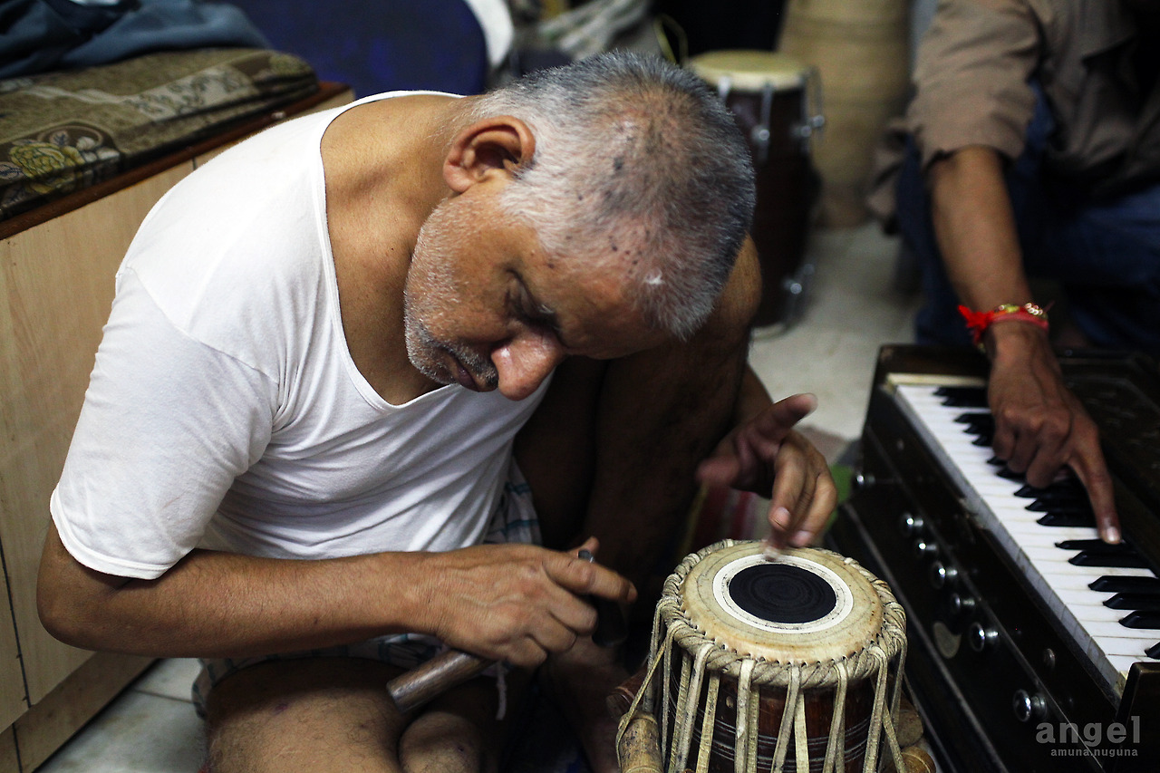인도의 대표적 전통 타악기 타볼라를 수리 중인 작은 공방에 들어갔다. 아무도 나를 신경 쓰지 않았다. 잠시 서 있다가 빈자리에 앉았다. 네댓 명의 사람들은 각자의 일을 하고 있었다. 앞을 보지 못하는 남자가 타볼라의 소리를 잡아내고 있었다. 옆에서는 한 사람이 작은 풍금의 건반을 일정하게 누르며 소리를 냈다. 남자는 건반 소리를 듣고 타볼라의 테두리를 작은 망치로 빗겨 내리치며 계속해서 왼손 검지로 타볼라를 땅땅 두드렸다. 건반의 음과 같은 소리를 찾고 있었다. 리듬악기라고 생각했던 타볼라가 멜로디를 이루는 하나의 음이 있었던 것이다. 그 음을 잡아 내고 있었다.