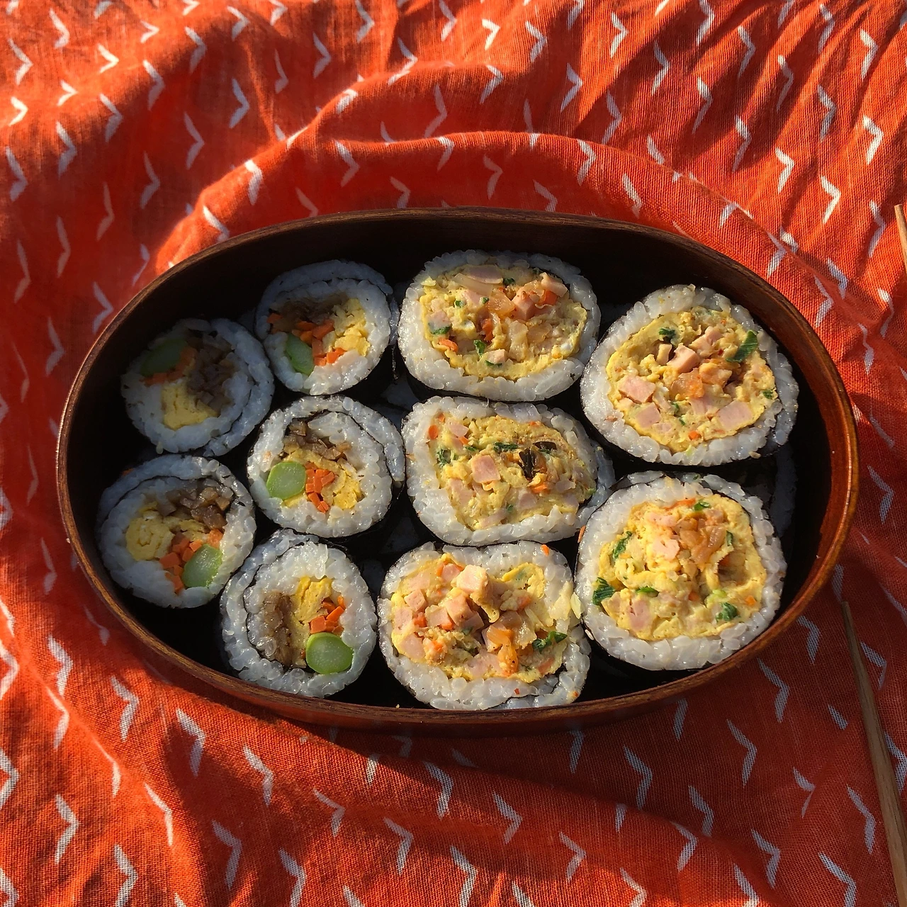아침에 일어나 창문을 열었더니 햇쌀이 봄기운이 느껴졌다. 아직은 춥지만 나가고 싶은 마음에 공원을 가기로 했다. 공원을 가기 위해서는 김밥을 만들기로 했다. 경쟁이 즐거운 우리는 서로 좋아하는 취향의 김밥을 만들기로 했다. 내가 만든 김밥은 우아!김밥 우엉과 아스파러거스가 들어간 김밥이다. 건강한 맛과 어울려 우아 김밥으로 정했다. 남편은 달마김밥 달걀마리 김밥을 줄여서 달마김밥... 남편답다.