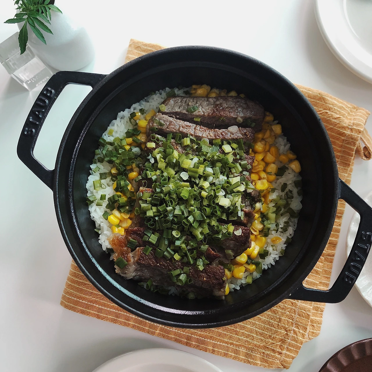 다음날 아침 삐-삐- 요란한 태풍주의보 문자 소리에 깼다. 밖은 이미 바람이 엄청 불고 있었다. 창문이 깨질까봐 테이프를 붙여야하나... 신문지를 붙여야하나... 무사히 태풍이 지나가길 기다리다가 남편이 배고프다는 말에 벌떡 일어나 스테이크솥밥을 하겠다며 신나서 주방으로 갔다. 사실 태풍이고 뭐고 그말을 해주길 바라며 기다리고 있었는지도 모른다. 씻을 쌀을 냄비에 넣고 뜨겁게 달군 팬에 고기를 올리는 순간 찌~~ 익~~~ 이미 남편의 몸은 주방에 와 있었다. 버터를 넣고 옥수수를 볶을 때는 침샘 폭발! 이제 밥 위에 옥수수, 스테이크, 쪽파를 넣고 15분 약불에서 뜸을 들이면 된다. 15분이 지난후 뚜껑을 열었는데... 와우 비쥬얼 최고!!! 헉- 잠깐...고기가... 너무 익었네... 이 좋은 한우 채끝을 내가... 망친건 아닌가 싶어서 걱정을하며 한입 먹는 순간! 와... 와... 엄지척! 너무 엄청 고소하고 부드럽다! 버터에 볶은 옥수수가 킥이였다. 남편도 한입 먹는 순간. 음~ 하는 탄식이 나왔다. 음식을 먹자 마자 나오는 음~ 이 소리는 어떤 평보다 솔찍하고 높은 평이다. 오늘의 메뉴는 몇 점이냐고 물었더니 9점! 10점 만점 주고 싶은데... 먹다 보니 좀 느끼해서 된장국이 좀 있었으면 10점 만점이라고 했다. 오늘의 스테이크 솥밥은 어른, 아이 모두 좋아할 메뉴로 가족메뉴!