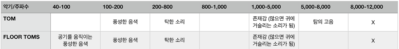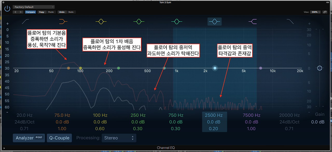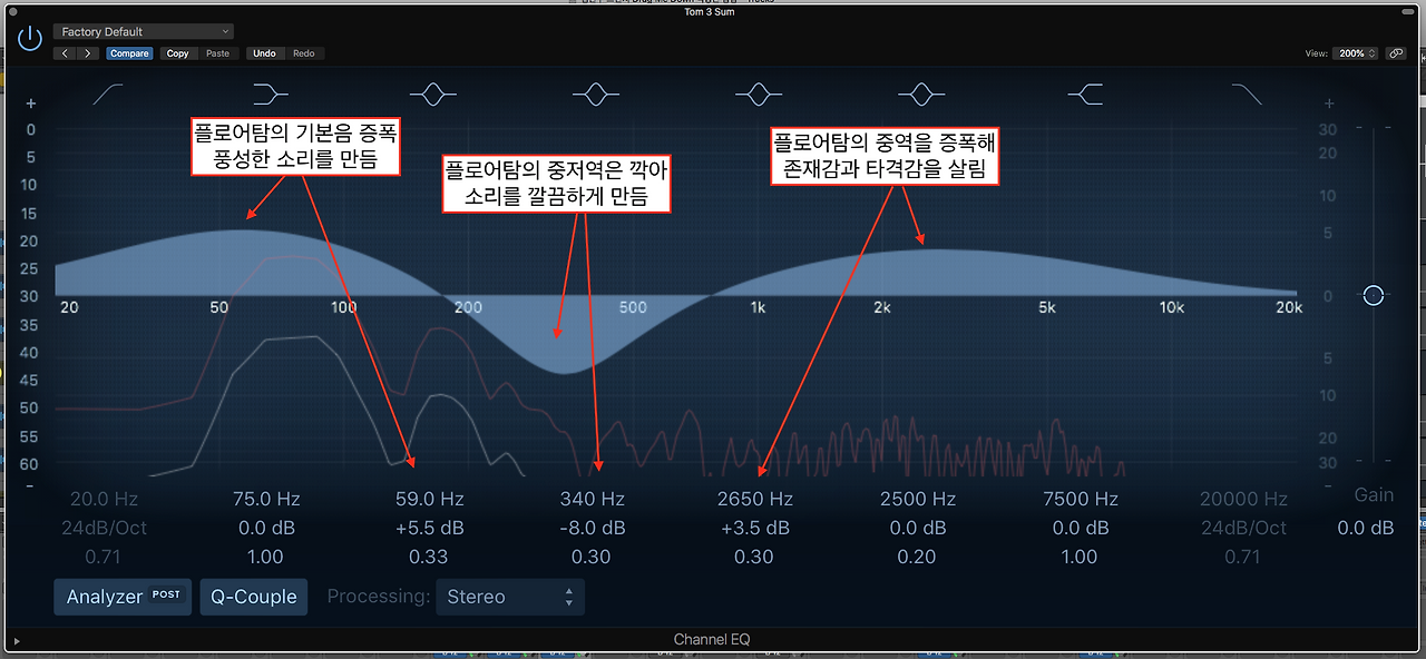 에널라이저를 보고 귀로 들으며 탐탐의 기본음역인 100Hz대역을 5dB정도 증폭하고 소리를 탁하게 만드는 중저역대를 깍아 저역대를 부각한 부분이 더 부각되게 하였고 탐의 타격감과 존재감을 더 잘 들리게 하기 위해 2400Hz대역을 4dB정도 증폭하였다.