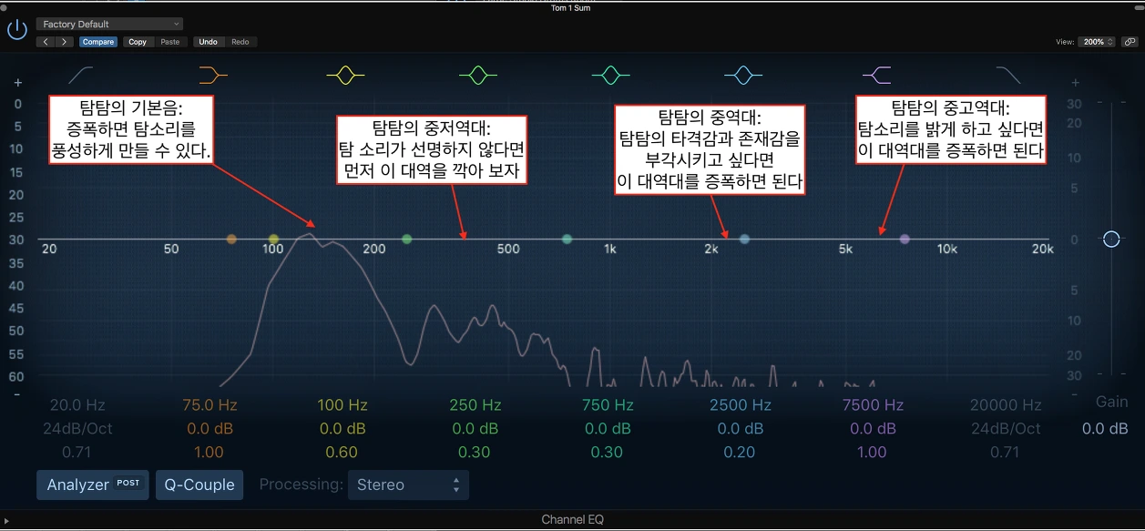 게이트와 컴프레셔를 세팅하였다면 탐탐의 음색을 만들어 보자. 이큐를 사용하기 전에 탐탐의 특징적인 주파수를 확인하도록 하자. 탐의 기본음은 약 100~200Hz대역이다. 이 부분을 증폭하면 탐탐소리가 풍성하여진다. 그리고 중저음인 200~800대역은 탐탐의 음색을 탁하게 만들기 때문에 탐소리가 탁하게 들린다면 이 부분을 깍아주면된다. 그리고 드럼스틱이 탐의 헤드를 타격하는 주파수대역은 2,000~4,000Hz 대역으로 탐탐의 존재감을 부각시켜준다.