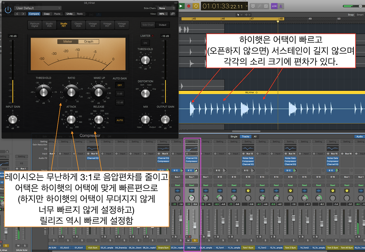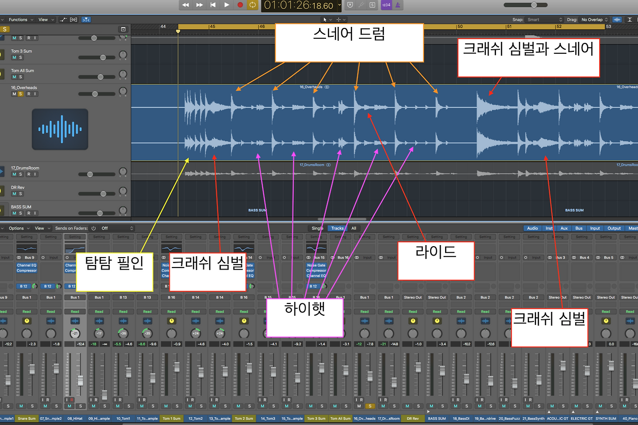 이렇게 하이햇과 오버헤드트랙을 작업하였다면, 이큐와 컴프레서를 사용하기 전 밸런스와는 다른 밸런스가 되었을 것이다. 잊지 말자. 믹싱에서 가장 중요한 부분은 밸런스이다. 페이더를 움직여 장르에 적합한 밸런스를 만들어 보자.