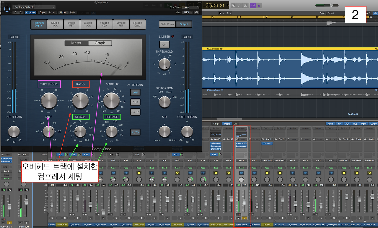 사용하는 컴프레서에 따라 오버헤드 트랙의 음색이 조금씩 차이가 난다. 그러니 몇가지의 컴프레서를 사용하면서 원하는 음색을 찾는 것이 좋다. 그리고 컴프레션을 조금 과하게 하는 경우라면 오버헤드 소리가 답답하게 들릴 수도 있으니 이럴땐 컴프레션을 줄이든지 아니면 DISTORTION을 약간 추가하여 질감을 회복시킬수도 있다.