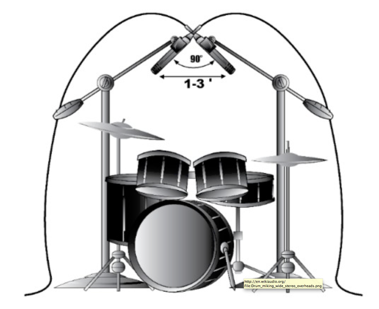 이때 심벌 소리 뿐만아니라 드럼 전체소리가 오버헤드 마이크로 들어온다. 오버헤드 마이크에 심벌소리를 더 들어오게 하려면 마이크를 아래로 조정하여야 한고 드럼 전체소리를 들어오게 하려면 오버헤드 마이크를 위로 올려야 한다. 하지만 이렇게 조정하여도 오버헤드 마이크에는 킥과 스네어, 탐, 하이햇의 소리가 들어오는 것을 막을 수는 없다.