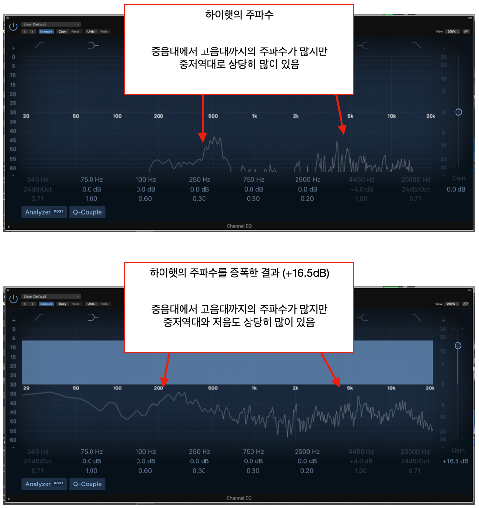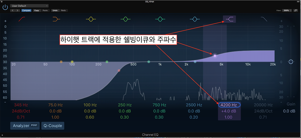 저음을 잘라낸 후, 중고역대를 키워 존재감과 선명감과 청명함을 부각시켰다. 이때 사용한 이퀄라이저는 쉘빙타입으로 4200Hz 이상의 주파수를 전체적으로 증폭하였다. 기준 주파수를 어디로 하느냐에 따라 하이햇의 음색을 조정할 수 있다. 예를 들어 가볍고 시원한 톤의 하이햇을 원한다면 로우컷을 좀 더 높게 잡고 고역대 이퀄라이저 역시 좀 더 높게 설정하면 되고, 묵직한 톤의 하이햇을 원한다면 로우컷은 하이햇의 기본음을 절대로 넘어서는 안되며 고음도 너무 키우지 않고 오히려 중저역대를 조금 키우는 것이 좋을 것이다. 하이햇 트랙의 이퀄라이저는 음악 장르에 잘 어울리게 하는 것이 중요하다.