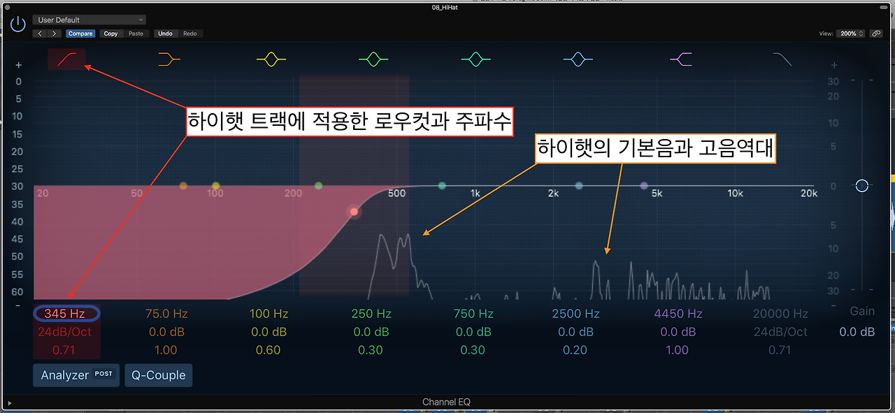 2. 하이햇과 심벌은 고음이 많고 저음은 주로 다른 악기들에서 유입되는 필요하지 않은 소리이다.