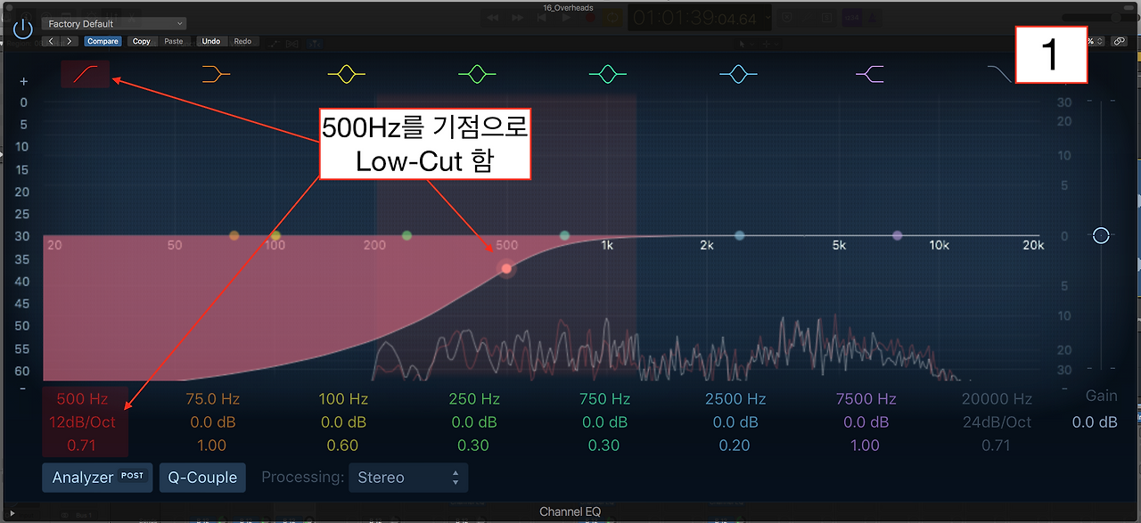 먼저 오버헤드 트랙에 로우컷을 적용한다. 탐탐 혹은 스네어 소리가 얼마나 작아지는 확인하면서 로우컷 주파수를 결정하면 된다. 다른 악기소리는 최소로 작아지고 심벌소리의 변형 역시 최소가 되도록 로우컷 주파수를 설정한다.