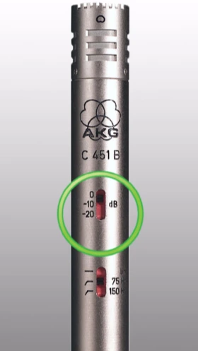 AKG C451B 마이크에 있는 조절 스위치들이다. 원안에 있는 것이 패드(Pad)인데 단위는 소리의 크기를 나타내는 dB이고 수치는 0 -10 -20정도로 조절된다. 일반적인 경우 콘덴서 마이크는 다이나믹이나 리본마이크에 비해 높은 출력을 가지고 있다. 그래서 음압이 높은 악기에 사용하게 되면 마이크 프리앰프에서 게인값을 조정하지 않아도 이미 입력단에 피크가 뜨는 경우가 있다. 이미 소리가 깨어져서 들어온다는 이야기이다. 그래서 마이크의 출력을 -10dB 혹은 -20dB정도 낮게 마이크 프리앰프로 보낼 수 있다. 마이크 프리앰프에도 이 패드기능이 있는데 둘 중에 아무거나 사용해도 똑같은 거 아닌가 하는 의문이 들 수도 있다. 설명하자면 가끔 높음 음압의 악기를 녹음할 때 소리가 너무 커서 마이크 프리앰프에 있는 패드를 사용해서 입력을 낮추었다. 마이크 프리앰프나 DAW미터에서는 피크가 뜨지 않는데 소리가 여전히 깨어지고 있다. 이러한 경우 마이크에 있는 패드를 사용해야 한다. 아주 높은 음압일지라도 마이크의 다이아프래임에서 왜곡이 생기는 경우는 극히 드물다 하지만 다이아프래임에서 출력된 신호가 마이크의 전기회로에서 왜곡되는 경우가 가끔있음으로 마이크의 패드를 사용하게 되면 이러한 현상을 막을 수 있다.
