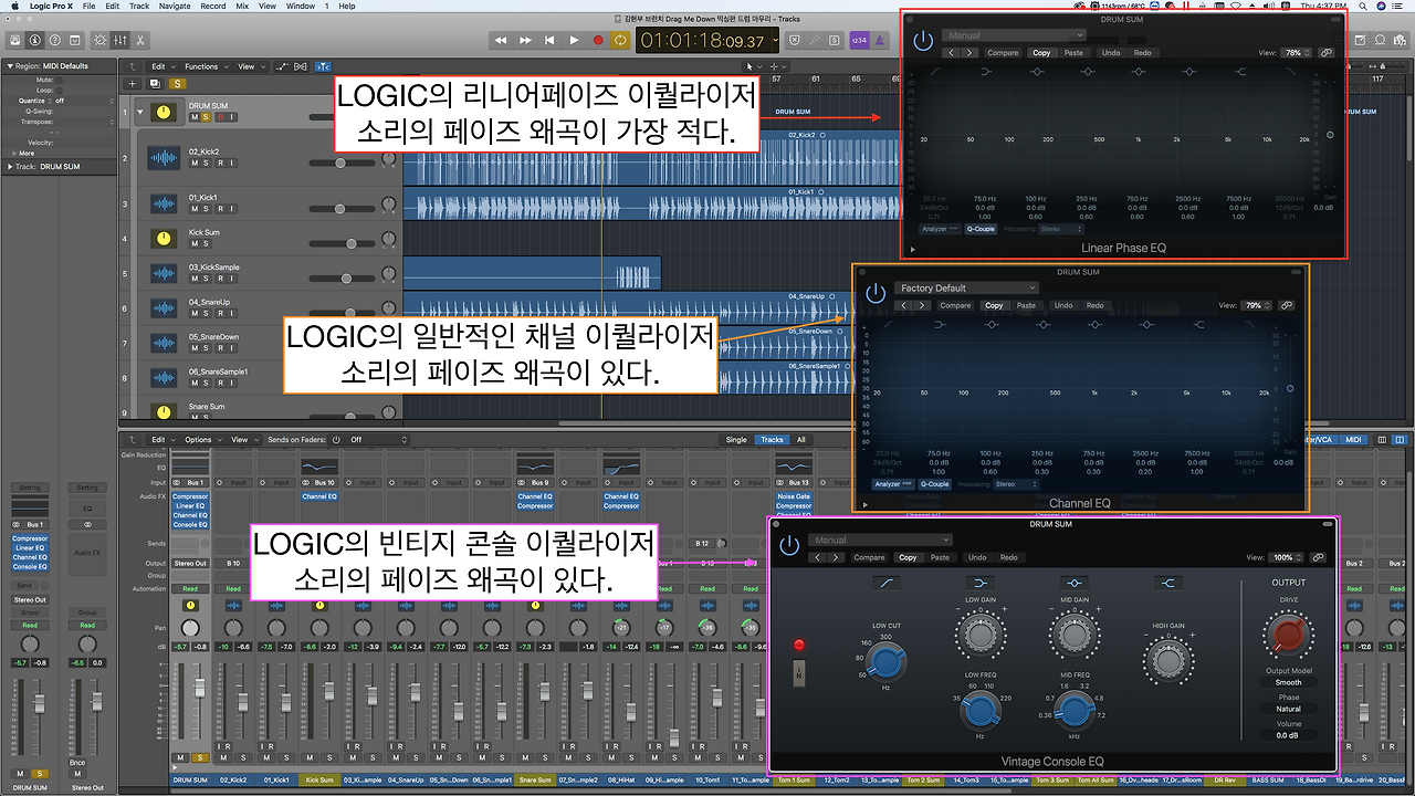 드럼 써밍 트랙은 개별 트랙보다 주파수의 범위도 넓고 여러 악기가 모여 있어 주파수도 복잡complex하다. 그러니 이큐는 개별 트랙에서 하는 것이 좋은 음질을 유지하기에 유리하다. 하지만 필요하다면 버스 이퀄라이저도 사용해야하니 가능하면 리니어페이저 이퀄라이저를 사용하자는 것이다.