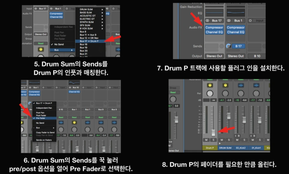 6. Drum Sum의 Sends를 길게 누르면 pre/post 옵셥이 나온다. 컴프레서를 페러렐 프로세싱 채널에 사용한다면 컴프레서로 입력되는 신호의 양이 일정해야 되기 때문에 Sends를 pre fader로 선택한다.