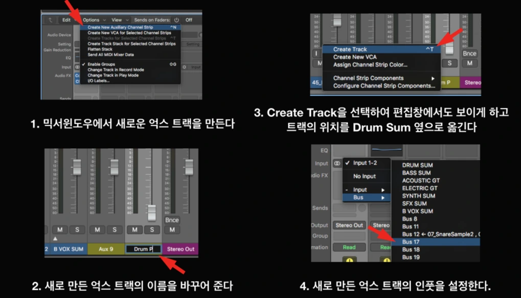 3. 새로 만든 억스 트랙은 믹서창에서는 보이지만 편집창에서 보이지 않고 트랙의 순서를 이동할 수 없기 때문에 Create Track을 선택하고 트랙의 위치를 Drum Sum 트랙 옆으로 옮기자.