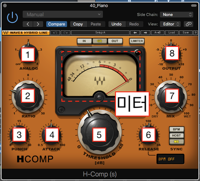 8. OUTPUT : 컴프레션 후 큰 소리가 작아지면서 전체적인 음압이 낮아지기 때문에 출력값을 올려 작아진 음압을 보정하는 노브로 MAKEUP GAIN이라는 용어로 사용되기도 한다. 어떤 종류의 컴프레서는 MAKEUP GAIN과 OUTPUT 노브가 동시에 존재하기도 한다.