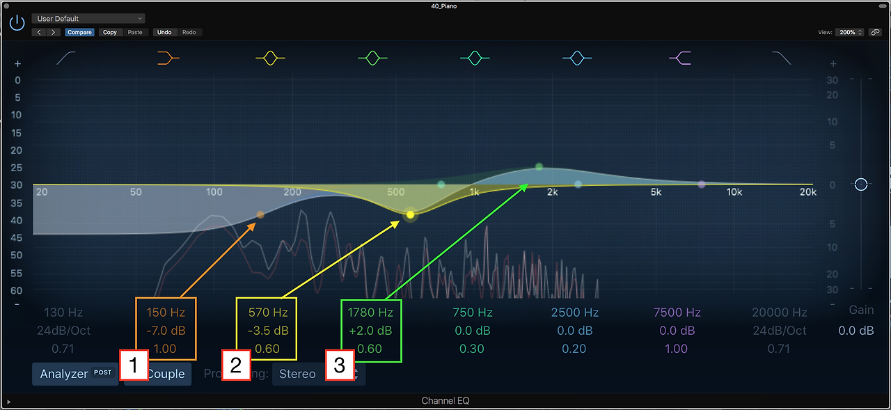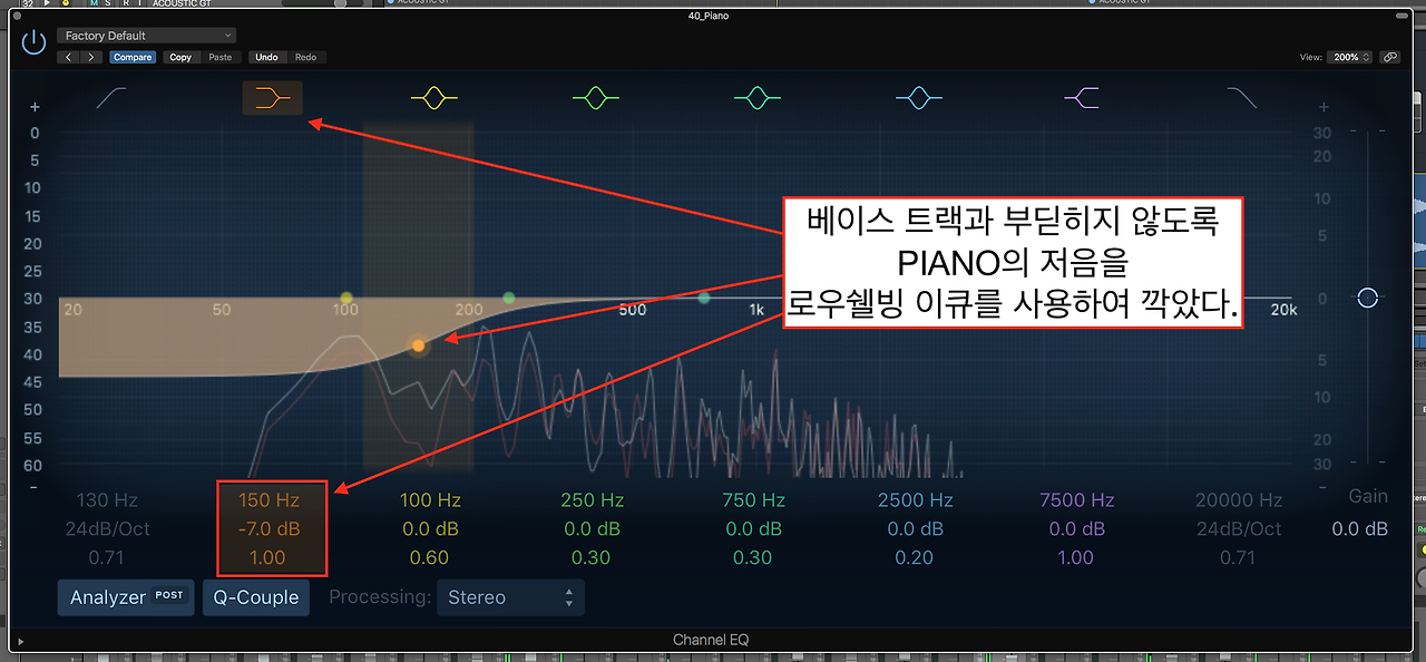 2. 피아노의 중저음은 탁한 소리를 유발하기 때문에 피아노의 소리를 좀 더 선명하게 하고 보컬의 중저음과의 충돌 그리고 스네이의 중저역대와의 충돌을 피하기 위해 설정하였다.