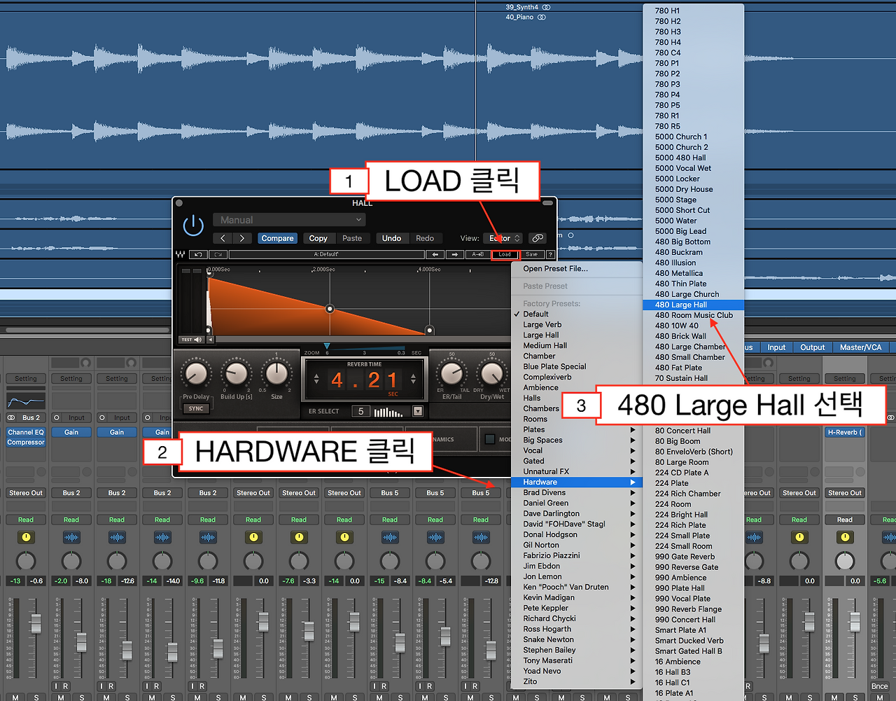 플러그 인을 구동하면 제일 먼저 뜨는 기본 세팅을 이용할 수도 있지만 리버브의 프리셋을 둘러 보도록 하자. 지금 찾는 리버브는 HALL 계열의 리버브이다. 이왕 이 플러그인을 선택한 김에 아주 훌륭한 한 프리셋을 열어 보자. 플러그인 프로그램에 있는 LOAD를 클릭하면 프리셋이 정신없이 펼쳐진다. 침착하자 아직 멀었다. 프리셋 중 가운데쯤에 있는 HARDWARE를 선택하면 프리셋이 현기증나게 펼쳐진다. 당황하지 말고 480 Large Hal을 선택하자. 플러그인 가운데 리버브 타임을 나타내는 숫자가 바뀌면 480 Large Hall이 로딩이 된 것이다. 480 이게 뭐라고 하겠지만, 이 숫자들의 비밀을 알고 나면 WAVES사나 H-REVERB에게 감사해서 절이라도 하고 싶을 것이다. 원래 하드웨어와는 다른 사운드이지만 아주 훌륭한 울림을 선사해 준다.