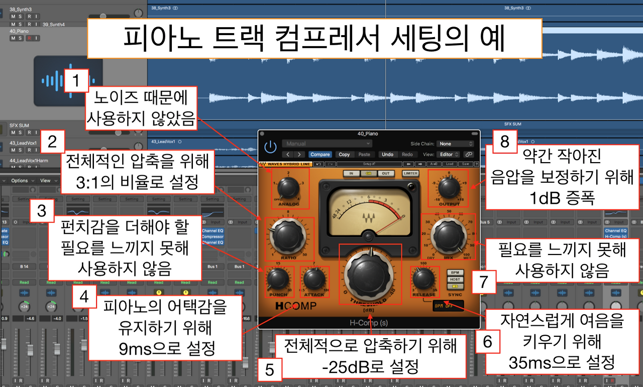 HCOMP로 피아노 트랙에서 약하게 연주된 부분의 음압을 키워 전체적으로 잘 들리게 하려면 어떻게 해야 할까? 기본적인 컨셉은 베이스에서 사용한 컴프레서 세팅과 같다. '베이스 트랙의 몇몇 부분의 음압이 너무 작을때 사용하는 컴프레서'를 다시 확인 하는 것도 좋다.