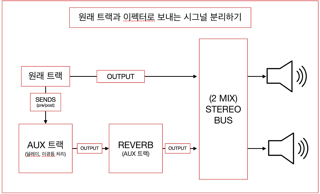 이런 신호의 흐름을 만드는 이유는 디테일하게 소리를 만들기 위해서이다. 원래 트랙을 바로 리버브로 보내도 되지만, 이 경우 원래 트랙의 소리가 그대로 리버브로 가기 때문에 그 트랙의 울림을 조정하려면 SENDS양을 조정한다든지, 아니면 리버브에 있는 설정노브를 바꾸는 방법밖에 없다. 예를 들어, 다른 트랙은 그대로 두고 신스 트랙의 울림만 부드럽게 만들고 싶다면 어떤 방법이 있을까? 물론 각 트랙에 리버브를 거는 것도 방법이지만 이 방법은 컴퓨터 CPU 사용의 효율성이나 믹싱 시간의 활용면에서 아주 좋지 않은 방법이다. 리버브 양을 늘리거나 줄이기 위해서는 모든 트랙의 리버브를 조정해야하는 경우가 발생한다. 이런 경우를 전문용어로 '삽질'이라 한다. 리버브 양은 간단하게 조정할 수 있는 것이 좋다.