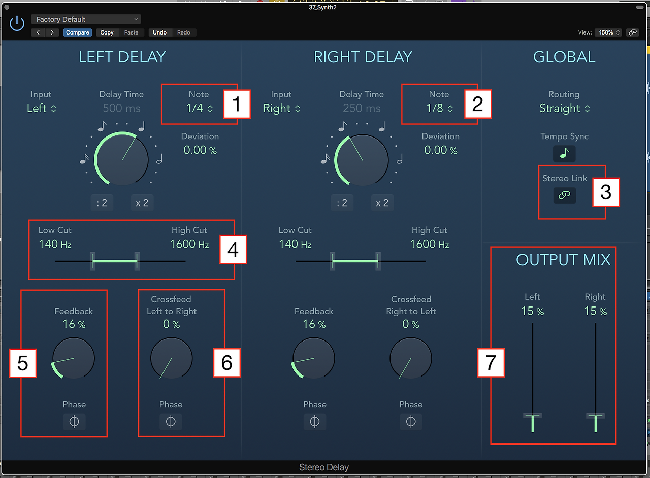 딜레이 타임을 템포와 다르게 세팅하여 특이한 효과를 연출할 수도 있지만, 일반적인 딜레이 효과는 곡의 템포와 일치시키는 것이 좋다. 그러니 믹싱하는 곡의 템포를 미리 파악하여 작업하는 세션의 템포를 설정해 하도록 하자. SYNTH 2 트랙에는 소리가 오른쪽에서 왼쪽으로 움직이는 딜레이 효과가 이미 있는 상태이니 곡이 너무 산만해지지 않게 스테레오 딜레이를 세팅하는 것이 좋겠지만 딜레이를 활용해 여러가지 시도를 해 보기를 추천한다.