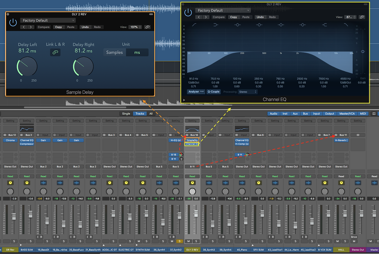 리버브가 소리를 살짝 부드럽게 만든다. 울림은 좋은데 살짝 무뎌지는 느낌이 싫다면 신스트랙에서 리버브로 보내는 신호에 짧은 딜레이를 주면 된다. 약 60~120ms정도의 딜레이를 주면 원음과 리버브사이에 시간차가 발생해 리버브가 원음의 선명도에 미치는 영향을 최소화할 수 있고 리버브도 더 잘 들리게 되는 효과를 만들 수 있다. 물론 리버브 플러그인에 있는 pre-delay를 조정해도 SENDS신호에 딜레이를 걸어 리버브로 보내는 것과 비슷한 효과를 만들수 있다. 하지만 리버브를 AUX로 다른 트랙들과 같이 사용한다면 그리고 어떤 트랙은 pre-delay를 사용하고 어떤 트랙은 pre-delay를 사용하지 않을 경우, 문제가 발생할 수 있다. 그리고 원래 트랙의 소리는 그대로 두고 이펙터로 보내는 소리만 조정하는 방법을 알아두면 다른 작업에 두고 두고 잘 사용할 수 있을 것이다.