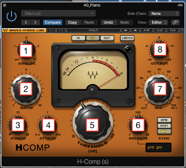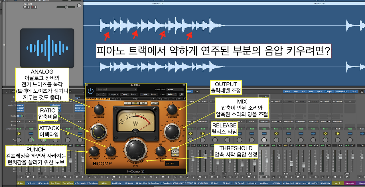 피아노 트랙을 들으니 몇몇 부분이 약하게 들린다. 컴프레서를 사용해서 약한 부분을 잘 들리게 만들어 보자. 이번에 사용할 컴프레서는 WAVES의 HCOMP이다. 그동안 로직 컴프레서는 많이 사용했기도 했고 다른 컴프레서를 보며 컴프레서를 잘 이해하고 있는지 확인할 필요도 있고 해서 그래도 조정 노브들이 비슷한 WAVES사의 HCOMP를 선택했다.