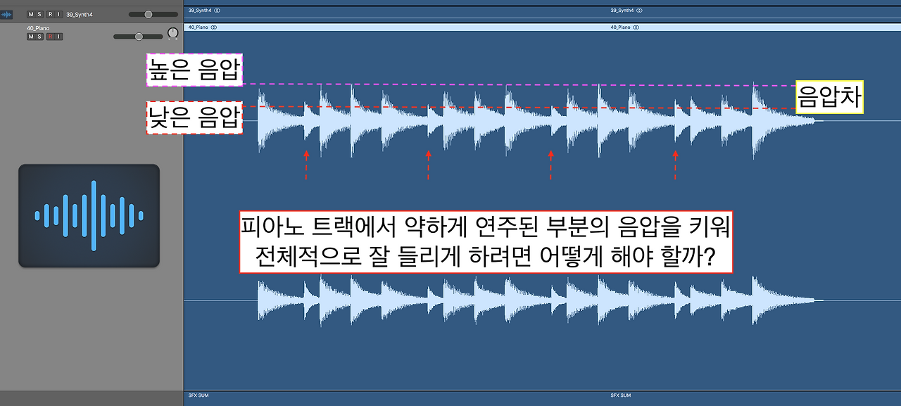 믹싱을 진행하면서 각 트랙에 집중하다 보면 전체적인 밸런스가 무너지는 경우가 종종있다. 그러니 곡 전체의 밸런스는 수시로 체크해야 한다. 피아노 트랙에 이큐, 컴프, 리버브 등의 효과를 넣기 전에 기본적인 레벨 벨런스를 다시 확인하여 적당한 음압을 찾아 보자. 물론 어떤 부분은 좀 크게 들리고, 어떤 부분은 좀 작게 들리기도 할 것이지만 먼저 적당한 레벨을 찾고 나중에 컴프레서를 사용하면 된다는 것을 우리는 알고 있다.