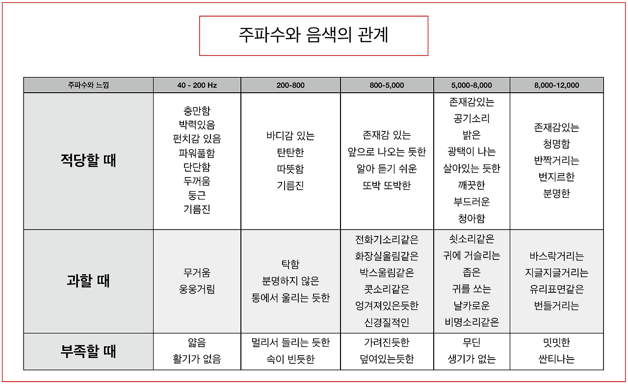 '주파수와 음색의 관계' 차트에 보는 바와 같이, 탁한 소리를 없에기 위해서는 200~800Hz를, 잘 들리게 하려면 800~12,000Hz를 조정해야 한다. 중음에서 고역대인 800~12,000Hz대역은 너무 넓기 때문에 800~5,000 / 5,000~8,000 / 8,000~12,000Hz로 나누어서 생각하는 것이 좋다. 각 중음 / 중고음 / 고음 영역대이다. 그리고 이 영역대를 키우면 소리가 분명해지지만 대역에 따라 소리가 분명해지는 느낌이 다르다. 각 대역대를 올리며 자신이 원하는 음색으로 만들다보면 좀더 세밀하게, 좀더 빨리, 좀더 정확하게 음색을 만들수 있게 된다.