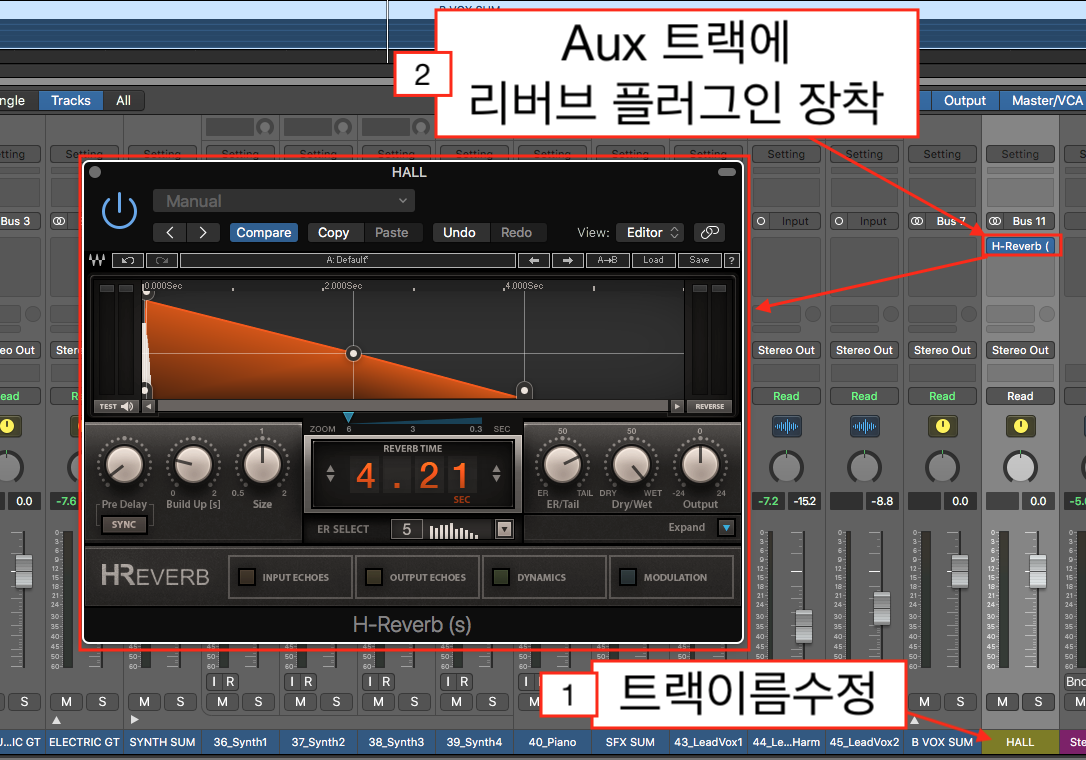 믹스창에서 AUX 트랙을 만들고 가장 먼저 할 일은 트랙의 이름을 수정하는 일이다. 앞서 설명한 바와 같이 아무일도 아닌 것 같고 별로 중요하지 않을 것 같지만 트랙수가 많아지면 많아질수록 트랙을 찾는데 허비할 시간을 줄여 줄 것이다. 그리고 AUX 트랙에 WAVES사의 H-REVERB를 장착한다. 피아노 트랙의 SENDS를 활성화 하고 이 AUX 트랙의 인풋 버스로 시그널을 보내면(sends) 리버브가 들리게 된다. 리버브 플러그인 가운데 있는 숫자 4.21은 리버브 타임 즉 공간 울림의 시간이다. 공간의 크기와 재질에 따라 리버브 타임이 다르긴 하지만 일반적으로 리버브 타임이 4.21초 정도되면 상당히 큰 공간이라 생각하면 된다.