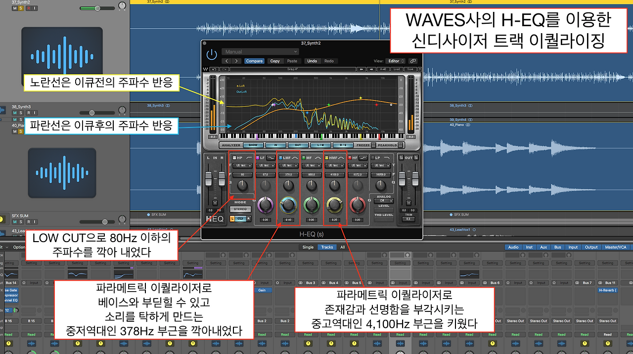 1. 로우쉘빙 이퀄라이징은 앞서 설명한 바와 같이 베이스의 저음과 충돌을 피하기 위해서 세팅한 것이다.