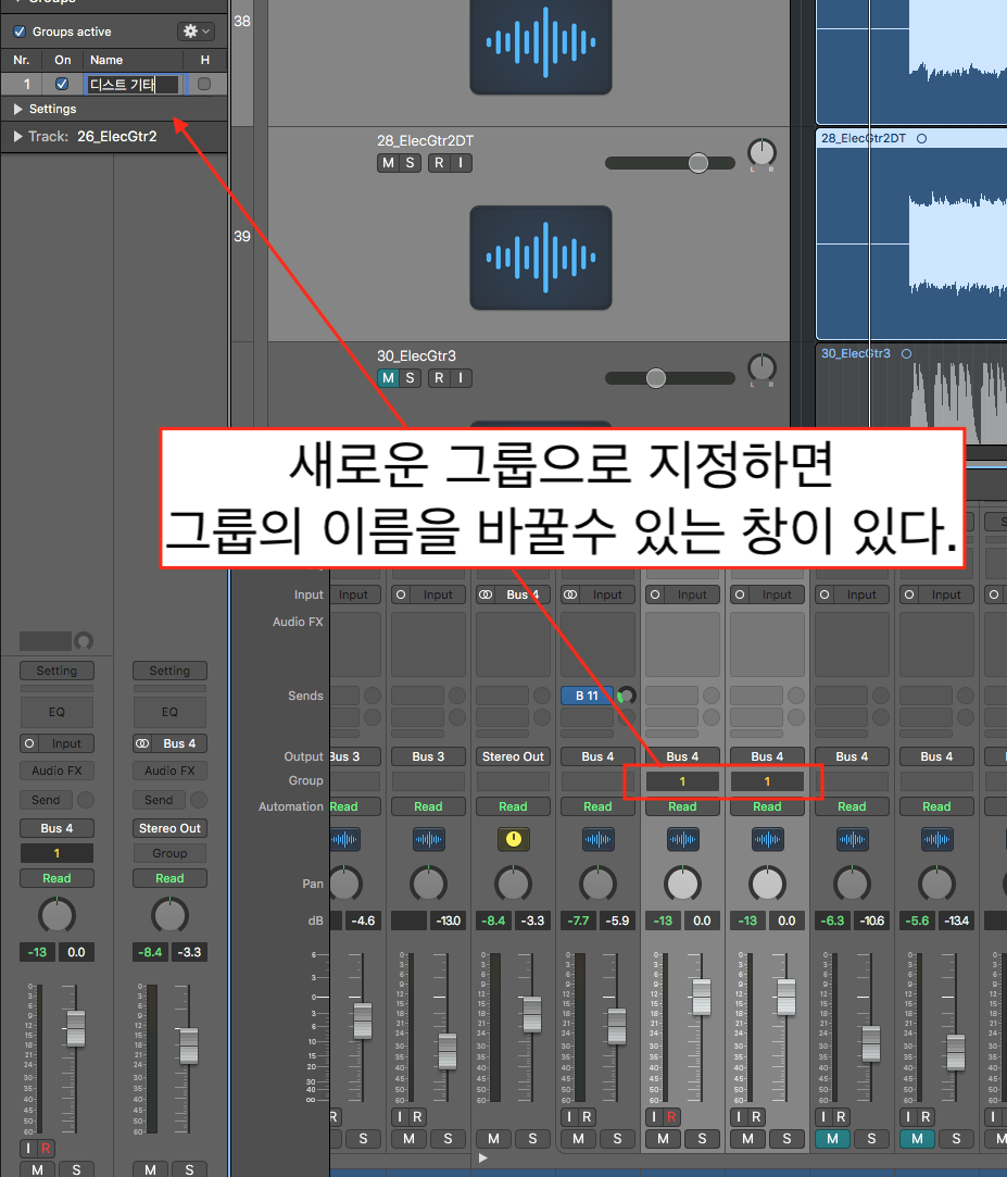그룹을 지정하면 그룹의 이름을 바꿀수 있는 창이 메인창 왼쪽 윗 부분에 나타난다. AUX 트랙을 만들고 난 뒤 이름을 변경하였듯이 그룹을 지정하고 나면 그룹의 이름도 바꾸어 주도록 하자.