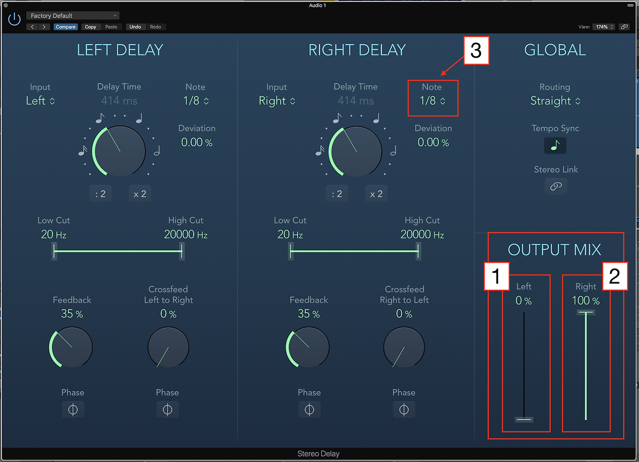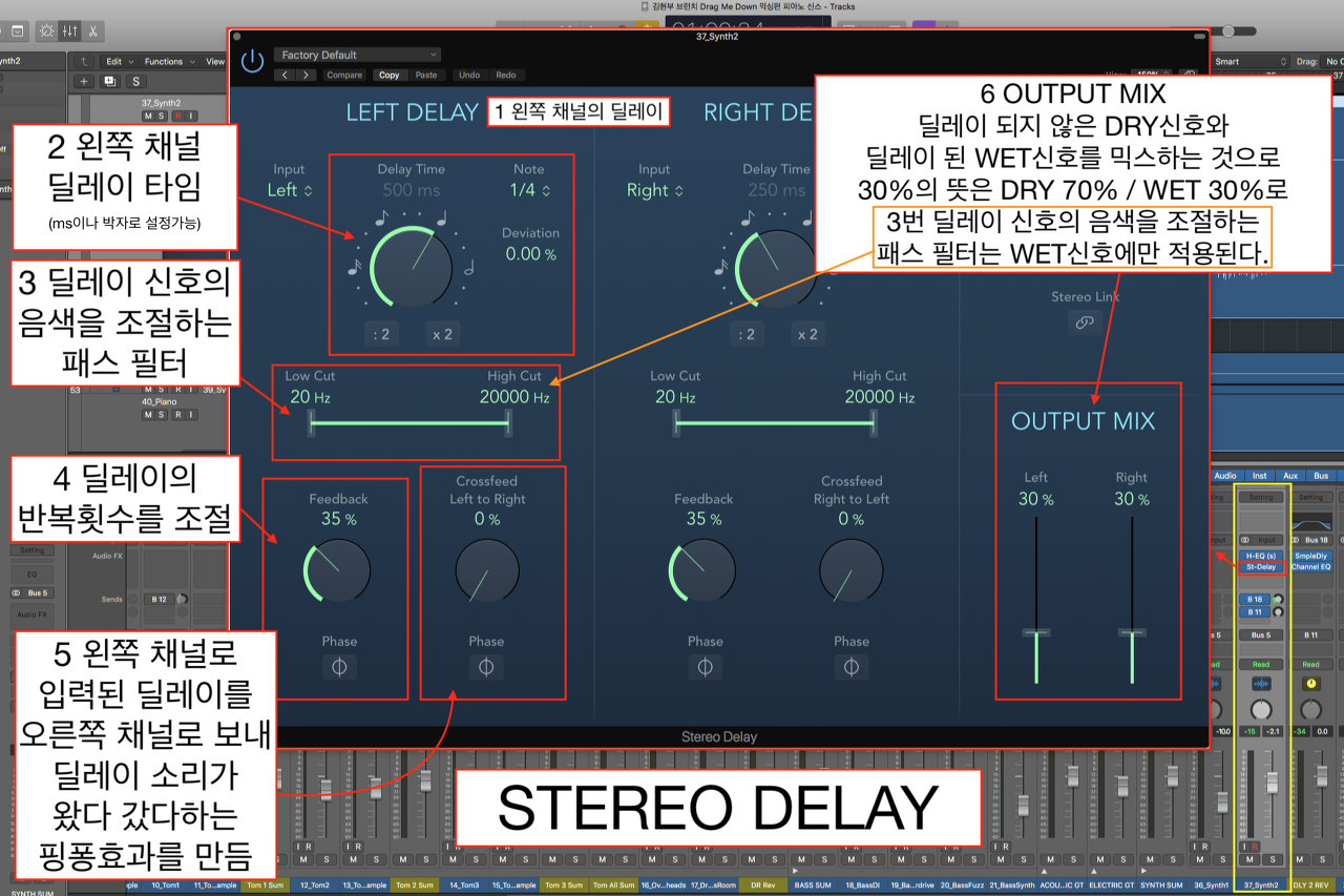 딜레이의 OUTPUT은 DRY 신호와 WET 신호의 비율을 조정할 수 있는데 왼쪽 그림에서 1번(왼쪽채널)과 같이 0%로 설정하면 딜레이 소리가 전혀 없는 DRY 소리만 출력되고, 2번(오른쪽채널)과 같이 100%로 설정하게 되면 DRY 소리가 없는 딜레이 된 소리만 출력된다. 이렇게 세팅하면 딜레이가 없는 소리가 왼쪽에서 먼저 나오고 오른쪽에서는 딜레이 된 소리가 따라 나와 스테레오 느낌을 주는 사운드를 만들 수 있다. 그리고 딜레이 박자는 3번 Note를 클릭하여 1/4(사분음표), 1/8(8분음표) 등을 선택할 수 있고 1/4 triplet (사분음 세잇단음표), 1/4 dotted (점사분음표)등의 박자들을 선택할 수 있다. 세팅한 결과 4분음표는 왼쪽과 오른쪽의 분리감이 심해 8분음표로 바꾸어 들어 보니 훨씬 더 안정적인 스테레오감을 만들었다.
