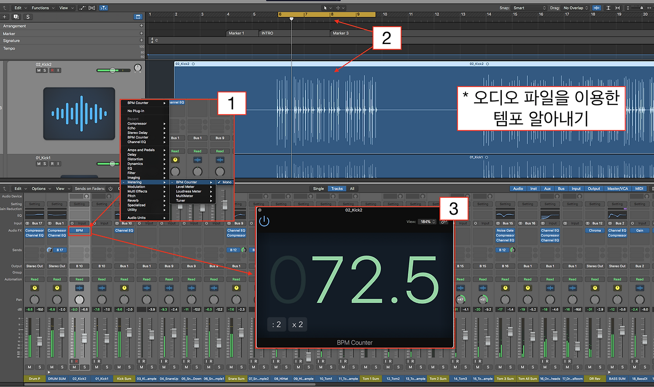 녹음할 때 부터 혹은 믹싱 프로젝트에 템포가 설정되어 있는 경우면 상관없겠지만, 곡의 템포가 설정되지 않은 세션을 받는 경우도 많다. 그런 경우 오디오 파일을 이용해 곡의 템포를 알 수 있다. 먼저 리듬을 연주하는 악기 트랙에 (드럼이나 베이스 등) BPM Counter 플러그인을 설치한다. BPM Counter는 Metering에 있다. 그리고 리듬악기가 연주되는 구간을 선택하여 재생하면 BPM Counter가 분석하여 곡의 템포를 알려준다. 다른 DAW에도 비슷한 기능이 있으니 사용하면 되고 그것이 어렵다면 스마트폰 메트로놈 어플을 다운받아 Tap을 하여 완전 수동으로 곡의 템포를 알 수 있다. 어쨌든 곡의 템포는 딜레이 플러그인을 효과적으로 사용하기 위해서 아주 중요한 것이니 어떤 방법을 사용하든 곡의 템포를 알아야 한다. 그리고 프로젝트나 세션의 템포를 바꾸어 주면 된다.