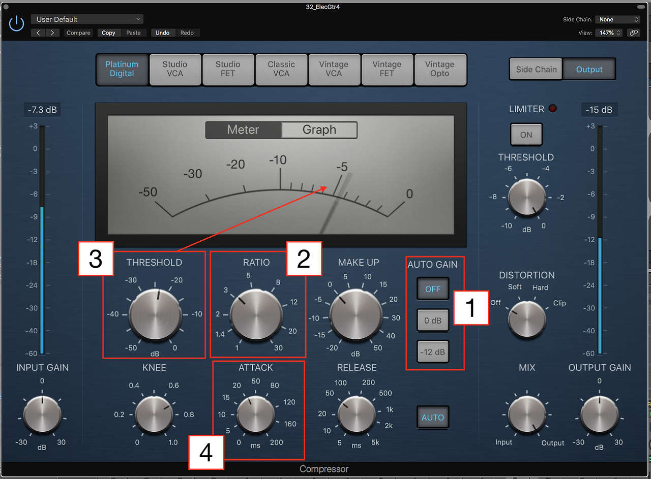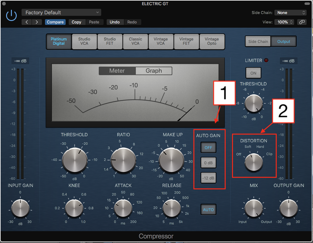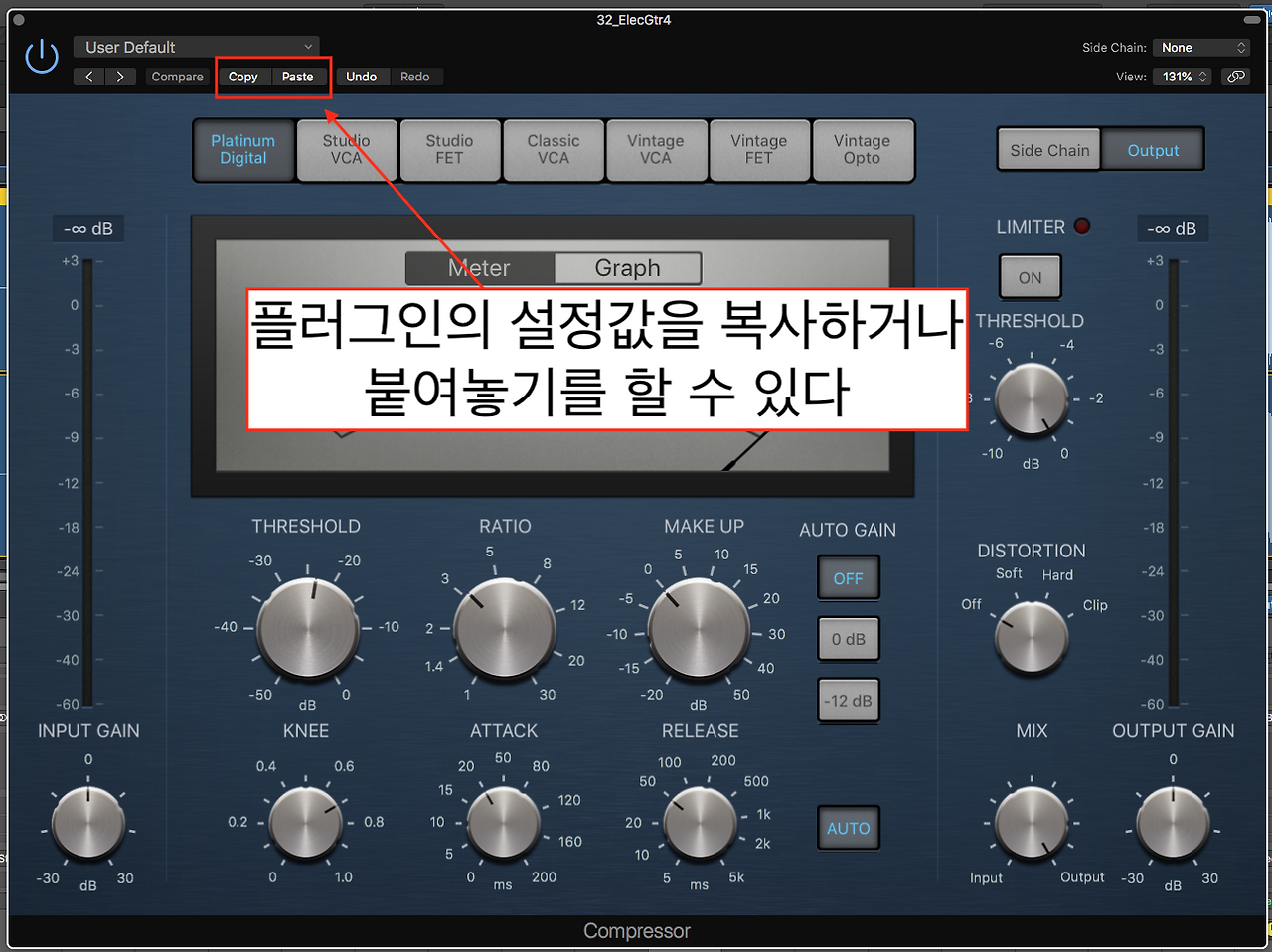 리버브를 추가하고 나서 보니, 일렉기타1 트랙의 음색이 나쁘지 않았고 특별히 고쳐야겠다는 생각이 들기 않았다. 만약 음색을 바꾸어야겠다는 생각이 들었다면 리버브를 추가하기 전에, 그러니까 트랙을 모니터링할때 음색을 바꾸고 싶었을 것이다. 그래서 이큐는 사용하지 않기로 했다. 대신 좀 더 풍성한 사운드를 만들기 위해서 세츄레이션을 사용하기로 했다. 로직 컴프레서를 열어서 기본 Platinum Digital 컴프를 사용해서 다른 세팅은 그대로 둔 채 먼저 AUTO GAIN을 OFF로 바꾸었다. AUTO GAIN이 0dB나 -12dB로 되어 있으면 트랙의 레벨이 바뀌기 때문에 레벨 밸런스가 많이 바뀌게 된다. AUTO GAIN을 OFF로 바꾼 뒤 DISTORTION 노브를 돌려 SOFT로 선택하여 일렉기타1 트랙 소리의 질감을 좀 더 풍성하게 만들었다. 소리의 질감이 풍성해지면서 레벨이 아주 살짝 커진 느낌이 있지만 전체적인 밸런스에 큰 영향을 주지 않아 볼륨페이더는 그대로 두었다. 하지만 만약 세추레인션때문에 레벨이 많이 바뀐다고 느끼면 볼륨페이더를 조정하여야 한다.