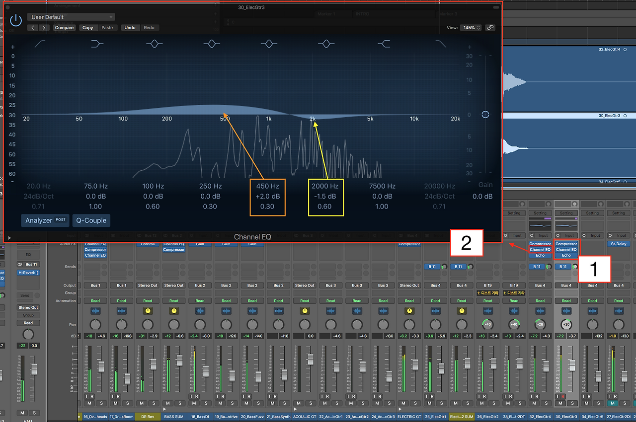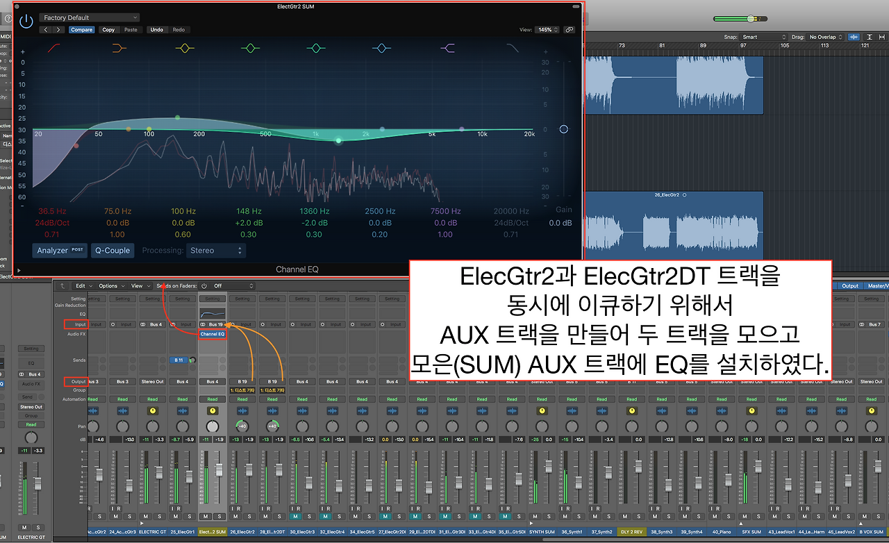 패닝을 설정하고 레벨을 다른 악기들과 어울리게 다시 조정하였다. 다음은 이퀄라이저이다. 디스토션 기타사운드를 좀 무겁게 만들고 싶어졌다. 이퀄라이저를 설치해서 조정하면 되지만 문제는 한번에 두 이퀄라이저를 동시에 조정하는 것이다. 몇몇 DAW는 그룹된 트랙의 플러그인을 동시에 조정하는 기능이 있지만 로직에서 찾아보기는 어려웠다. 스테레오 트랙의 음색을 조정하기 위해서는 두 채널을 동시에 들으면서 이퀄라이징 하는 것이 효과적이다. 이렇게 두 채널을 동시에 이퀄라이징을 해야 한다면, AUX 트랙으로 두 채널을 묶는(Summing) 방법이 귀찮기는 하지만 효과적인 방법일 것이다.