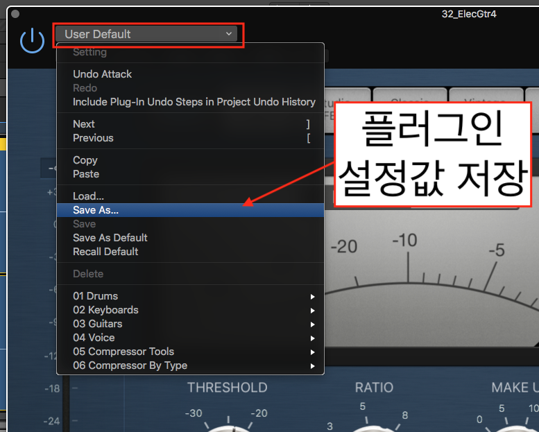 컴프레션은 두 트랙 모두 일렉기타4 트랙에 설치하였던 컴프세서 세팅을 사용하였다.