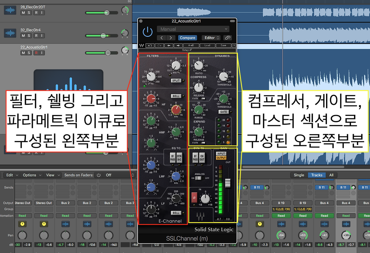 어쿠스틱기타 1 트랙 소리를 좀 더 일정하게 만들어 계속 잘 들리게 하려면 컴프레서를 사용하여야 한다. 그리고 컴프레션을 하면서 동시에 음색도 조절하면 좋은 경우가 있다. 이럴땐 컴프레서와 이퀄라이저 등이 같이 있는 플러그인을 사용하면 된다. 이런 플러그인을 채널스트립이라 부른다.