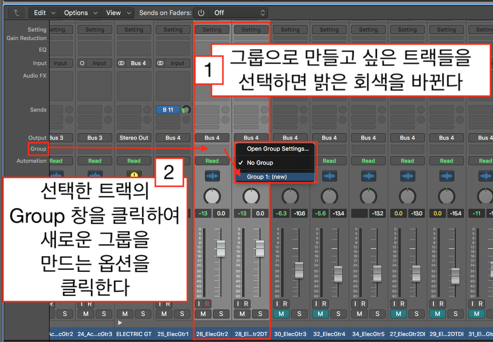어쨌든 더블링 트랙은 좌우 레벨을 거의 비슷하게 맞추고 레벨을 조정할 때 좌우 트랙을 같은 값으로 움직여야 하기 때문에 더블링 트랙을 그룹으로 묶어서 같이 움직이도록 하는 것이 좋다. 그룹을 만들기 위해서 메인창이나 믹서창에서 comman나 shift를 누른 상태에서 옆에 위치한 트랙을 선택하면 트랙이 밝은 회색으로 바뀐다. 일단 밝은 회색으로 바뀐 트랙들은 다른 설정을 하지 않아도 임시 그룹으로 묶어 있다. 하지만 다른 트랙을 선택하게 되면 이 임시 트랙은 풀리게 된다. 믹스하는 동안 일렉기타2와 일렉기타2더블링 트랙을 그룹으로 사용하기 위해서는 그룹으로 지정해야 한다.