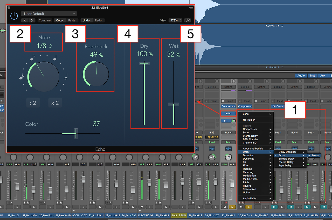 곡의 템포를 파악했다면 이제 일렉기타4 트랙에 스테레오 딜레이를 사용하여 보자. 목표는 딜레이 안 된 소리는 왼쪽에서, 오른쪽에서는 딜레이 된 사운드가 나오게 하는 것이다. 일렉기타 4 기타 소리는 왼쪽에서 먼저 나오고 4분음표(한박자) 혹은 8분음표(반박자) 혹은 이분음표(두박자) 뒤에 오른쪽에서 기타 소리가 나게 세팅하는 것이다. 믹싱에서 어떤 효과를 만들기 위해서는 한 가지의 방법만 존재하지 않는다. 다양한 방법으로 어떤 효과를 만들 수 있다. 그러니 다양하고 유동적이며 창의적인 시도를 해 보기를 권해 본다.