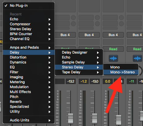 모노를 스테레오로 바꾸어주는 플러그인은 사실 입력이 모노, 출력이 스테레오인 플러그인을 말한다. 모노 트랙에서 플러그인 선택창을 누르면 플러그인을 모노로 사용할 지 아니면 모노->스테레오로 사용하지 선택하는 창이 나온다. 하지만 이큐나 컴프레서 플러그인 창에서는 이 옵션을 볼 수 없고 주로 스테레오감을 주는 공간계 플러그인인 딜레이나 리버브 그리고 모듀레이션, 필터 계열의 플러그인에서 이 옵션을 발견할 수 있다. Mono->Stereo 플러그인을 선택하면 트랙의 meter 역시(당연하게) 모노에서 스테레오로 바뀐다.