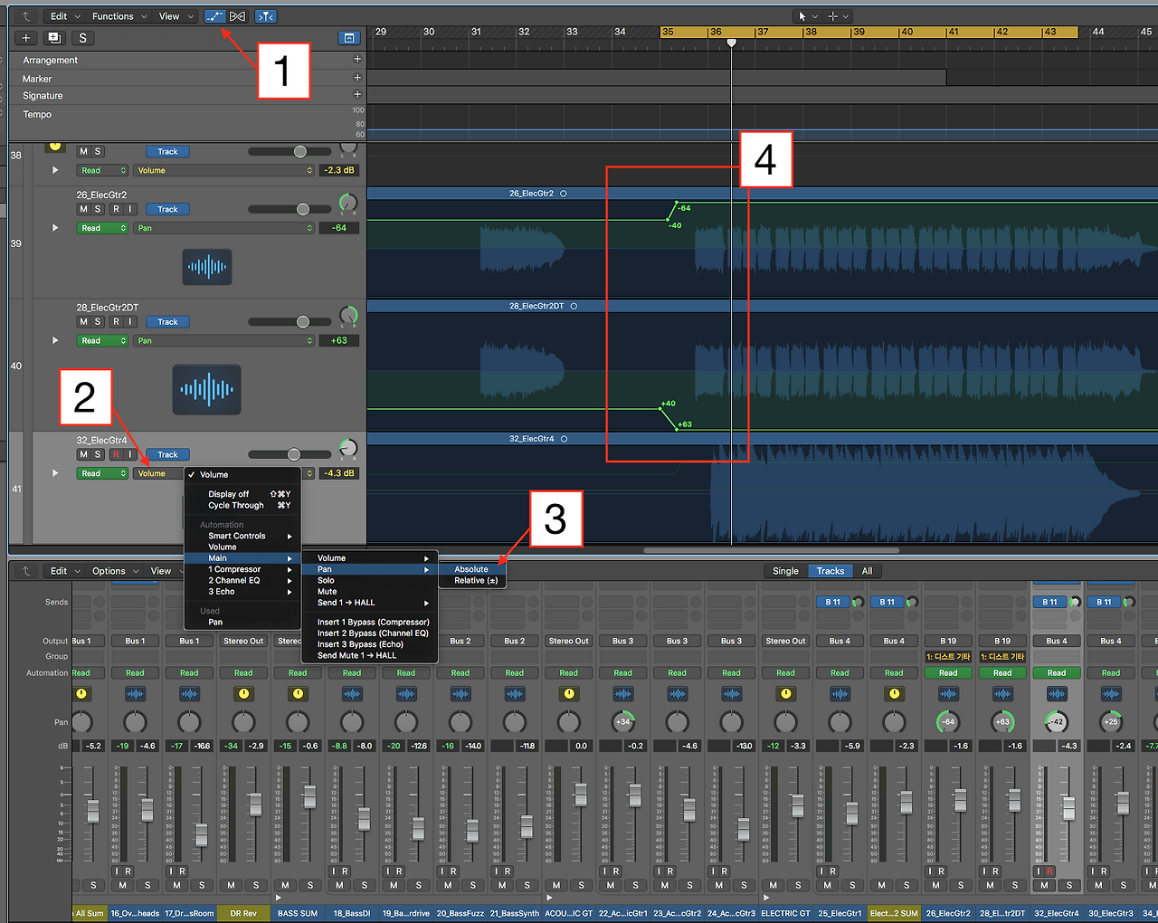 고민 끝에, 어쿠스틱 기타가 나오는 부분부터 기타의 패닝을 전체적으로 바꾸기로 했다. 먼저 일렉기타2트랙와 더블링 트랙의 패닝은 완전히 펼치기로 했다. 이전의 패닝은 그대로 유지하면서 특정한 구간부터 혹은 특정한 구간의 패닝을 조정하려면 오토메이션(automation)이라는 기능을 사용해야 한다. 오토메이션은 세부적인 조정에 사용하는 기술로 볼륨, 팬, 뮤트등 기본적이 기능을 조절 할 수 있을뿐 아니라 플러그인의 노브까지 개별적인 조정이 가능하다.