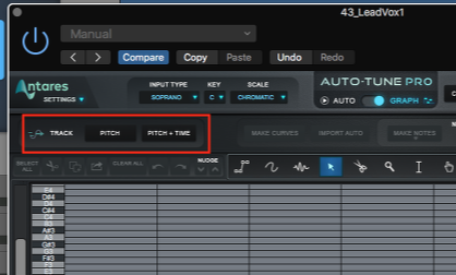 TRACK 모드는 PITCH와 PITCH+TIME이 있다. 먼저 PITCH는 피치 즉 음만 수정하는 경우에 사용하고 PITCH+TIME은 음과 박자를 같이 수정하는 경우에 사용한다. 일반적으로 보컬을 튜닝할 때 음과 박자를 같이 수정하기 때문에 트랙 모드는 PITCH+TIME으로 선택하는 거이 좋다