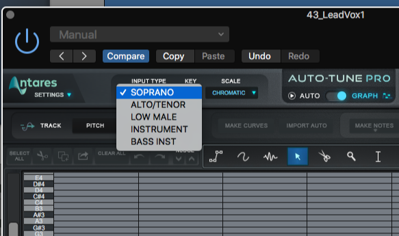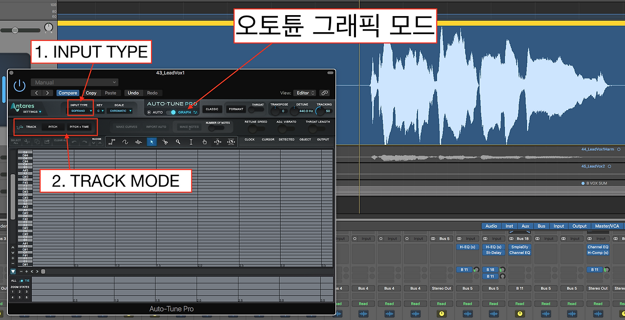 오토튠의 그래픽 모드를 선택하면 오토튠 창이 그래픽 모드로 바뀐다. 이때 확인해야 하는 것이 INPUT TYPE과 TRACK MODE이다.