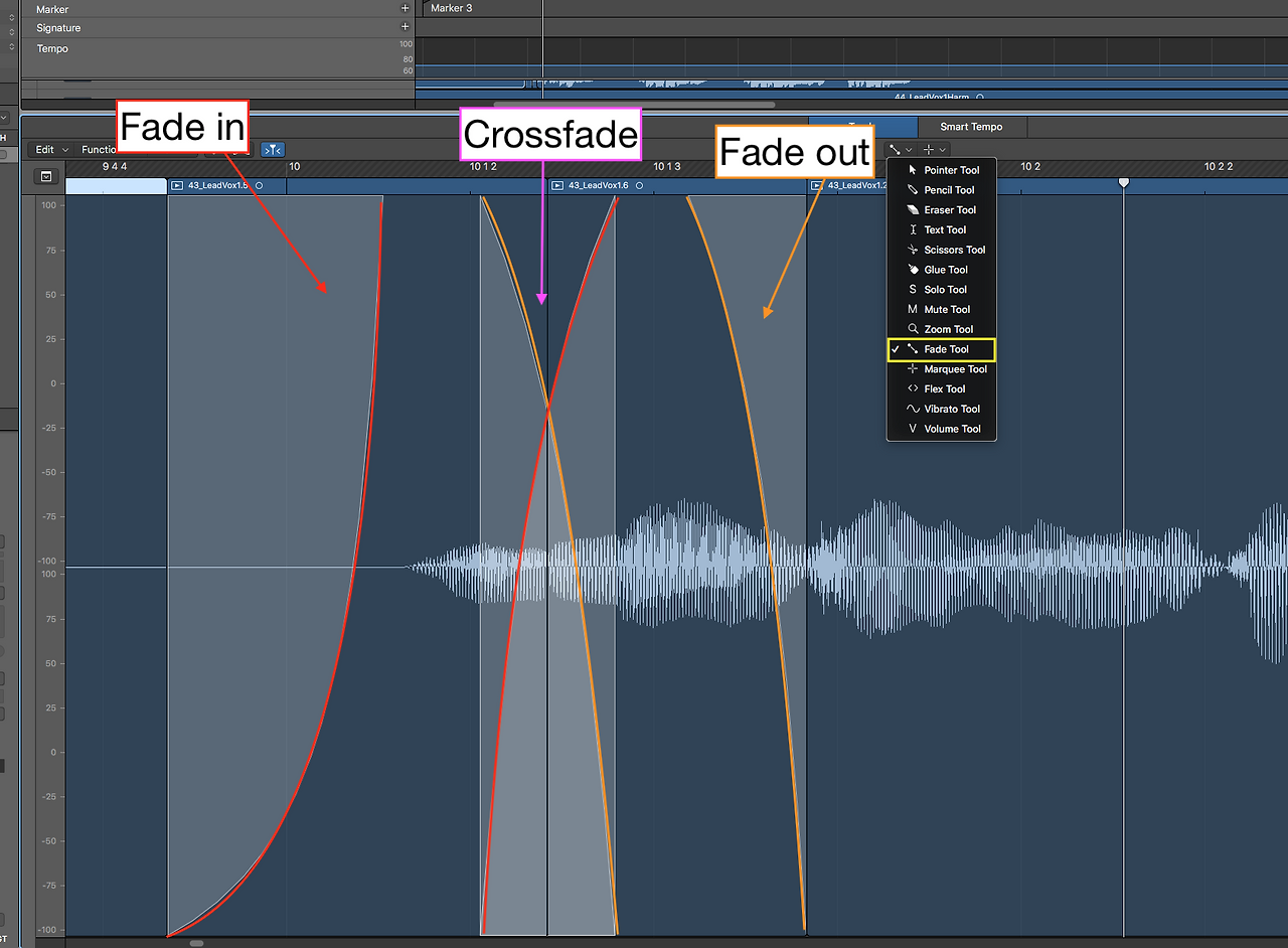 각 테이크를 부드럽게 연결하기 위해서는 페이드처리가 필요하다. 페이드는 트랙의 소리를 점진적으로 (gradually) 올리거나 내리는 것을 말한다. 보컬 트랙에 웨이브파형이 나타나지 않은 경우라면 아무 소리가 없는 것으로 생각되지만 파형을 확대하거나 볼륨을 높이면 소리가 아주 작게 녹음되어 있음을 알 수 있다. 그러니 소절과 소절사이, 간주등과 같이 노래하지 않는 부분은 과감하게 잘라내어 버리자. 녹음 당시 헤드폰에서 흘러나온 소리가 녹음되어 있을 것이다. 그리고 테이크의 시작이나 끝에 웨이브파형이 표시되어 있지 않더라도 페이드 처리를 해 주는 것이 혹시 발생할지도 모르는 노이즈를 없앨 수 있다. 페이드 각도는 페이드 툴을 선택하고 나면 조정이 가능해 진다. 테이크의 시작이나 끝을 페이드할때 페이드 각도를 조정하면 보다 자연스러운 페이딩이 가능하다.