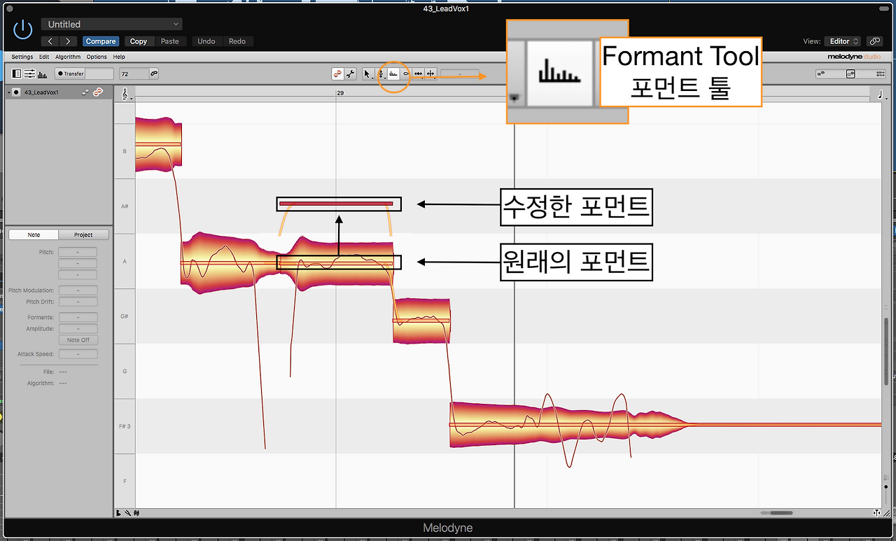 노트 툴은 특정한 구간은 음표처럼 만드는 것이다. 원하는 구간을 선택하면 파란칸으로 표시되고 선택을 마치면 파란칸안의 피치가 센터 피치에 맞게 수정된다. 그리고 화살모양으로 생긴 선택툴을 이용하여 위, 아래로 피치를 수정할 수 있다.