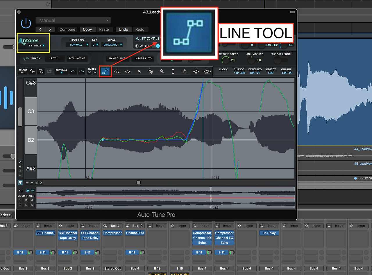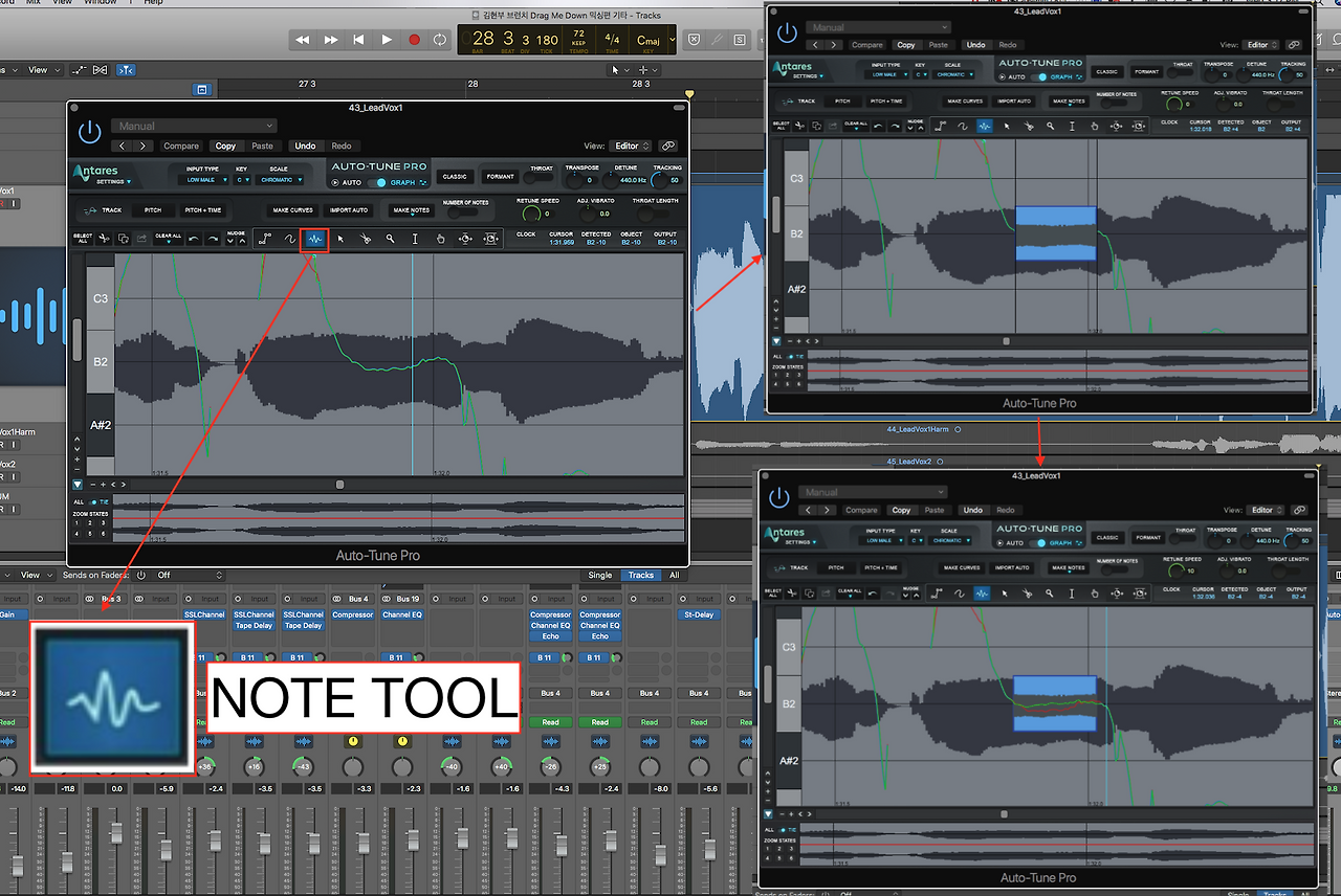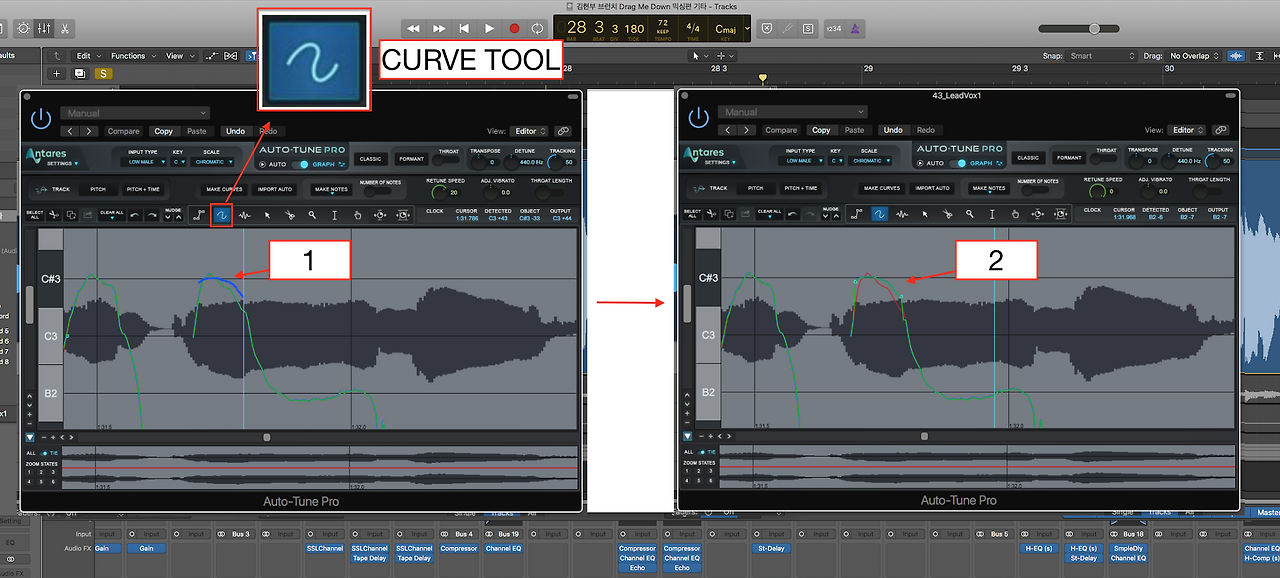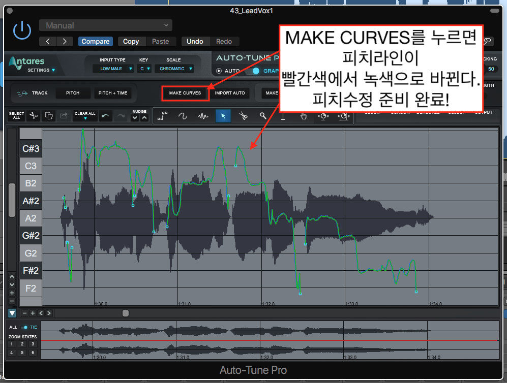 스페이스바를 눌러 재생을 시작해 보컬 트랙의 피치를 트랙킹하는 작업을 마치면 오토튠 창의 피치가 빨간색으로 표시된다. 그럼 MAKE CURVES를 누른다. 빨간색으로 표시된 피치가 녹색으로 바뀌며 피치수정 준비가 완료된다. 그럼 웨이프 파일이 보이는 창 상단에 있는 툴들을 사용해 튜닝을 시작할 수 있다. 진한 회색으로 표시된 웨이브 파형과 녹색으로 표시된 피치를 보며 수정을 시작해 보자. 그럼 어디에다 무엇을 맞추는 것일까?